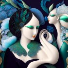 The artwork features two elegant herons poised gracefully against a dark background, surrounded by vibrant blue flowers and a serene moonlit water scene, evoking tranquility and nature's beauty.