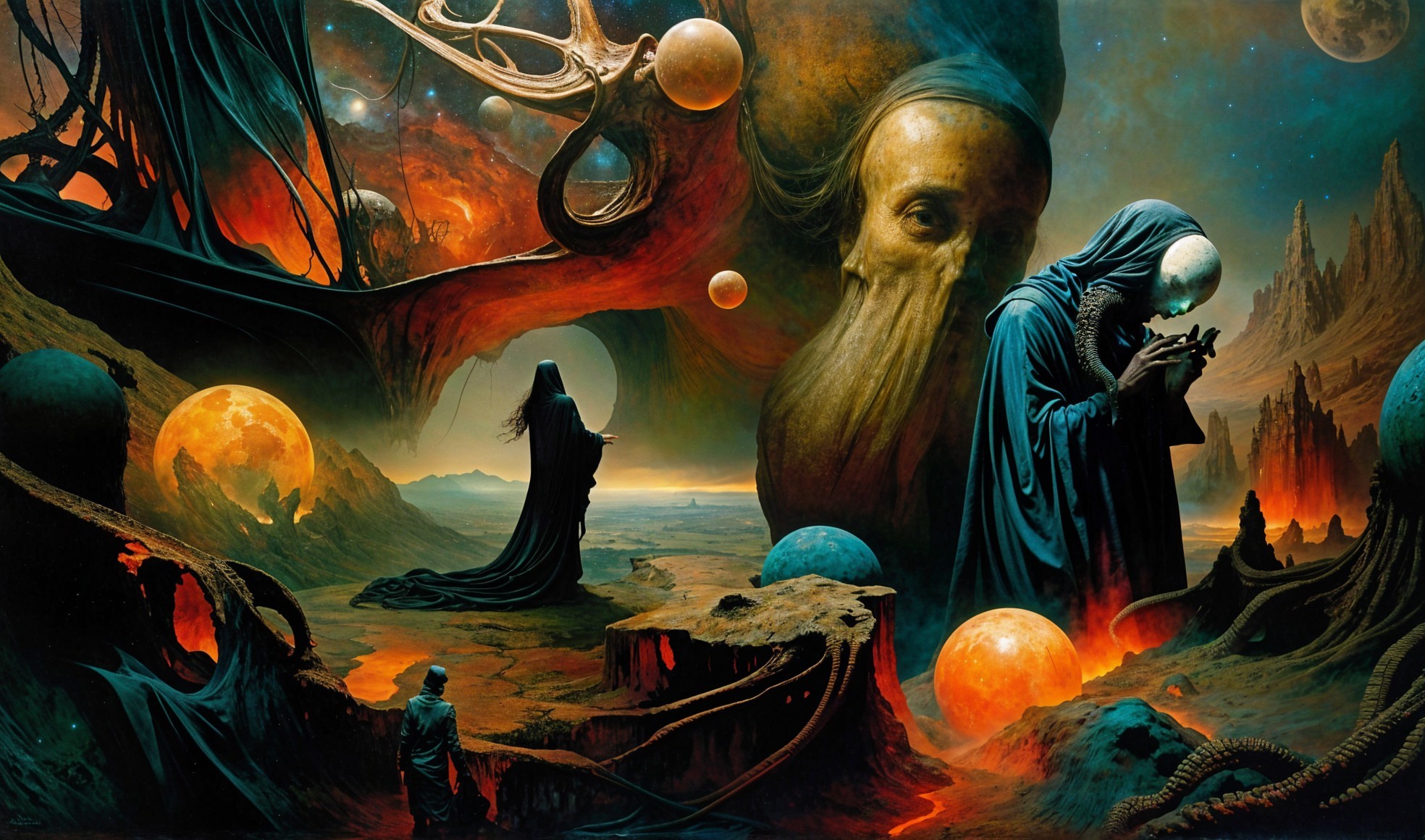 A mystical landscape featuring hooded figures against a backdrop of swirling galaxies, glowing celestial bodies, and eerie, twisted formations. The atmosphere is otherworldly and surreal.