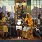 A group of five people stands together in a sunlit apartment, sharing smiles and connection. A visibly pregnant woman in has a contraction, and holds hands with others, set against a city backdrop.