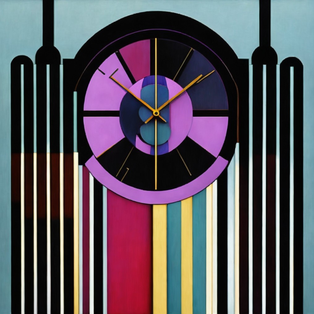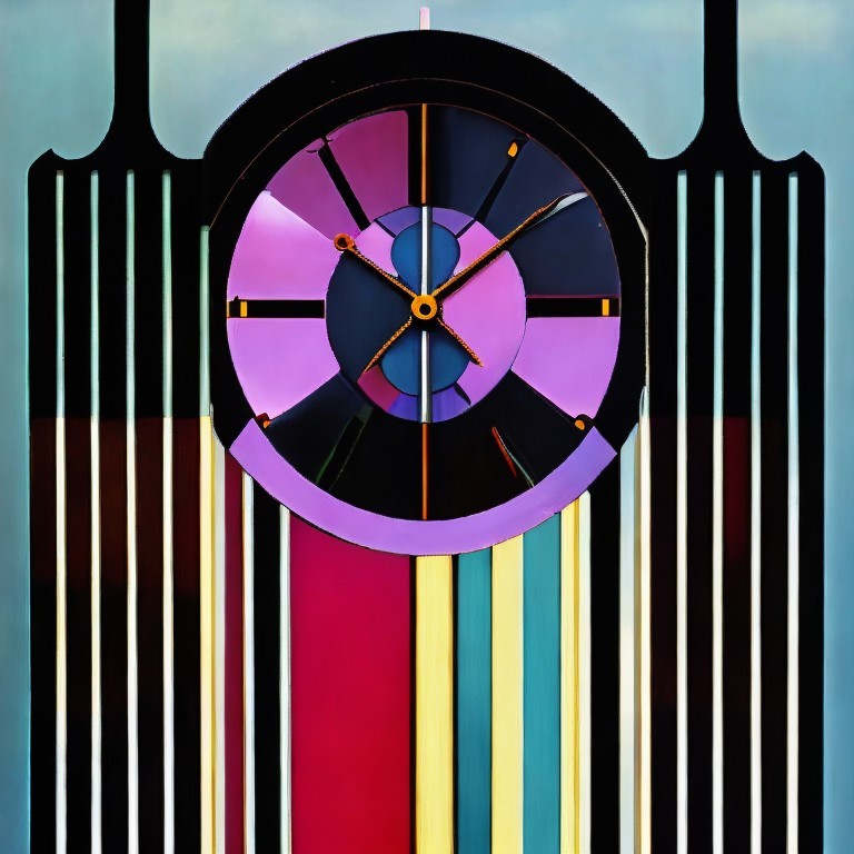 Abstract art featuring a stylized clock with colorful vertical stripes and geometric shapes on a blue background.