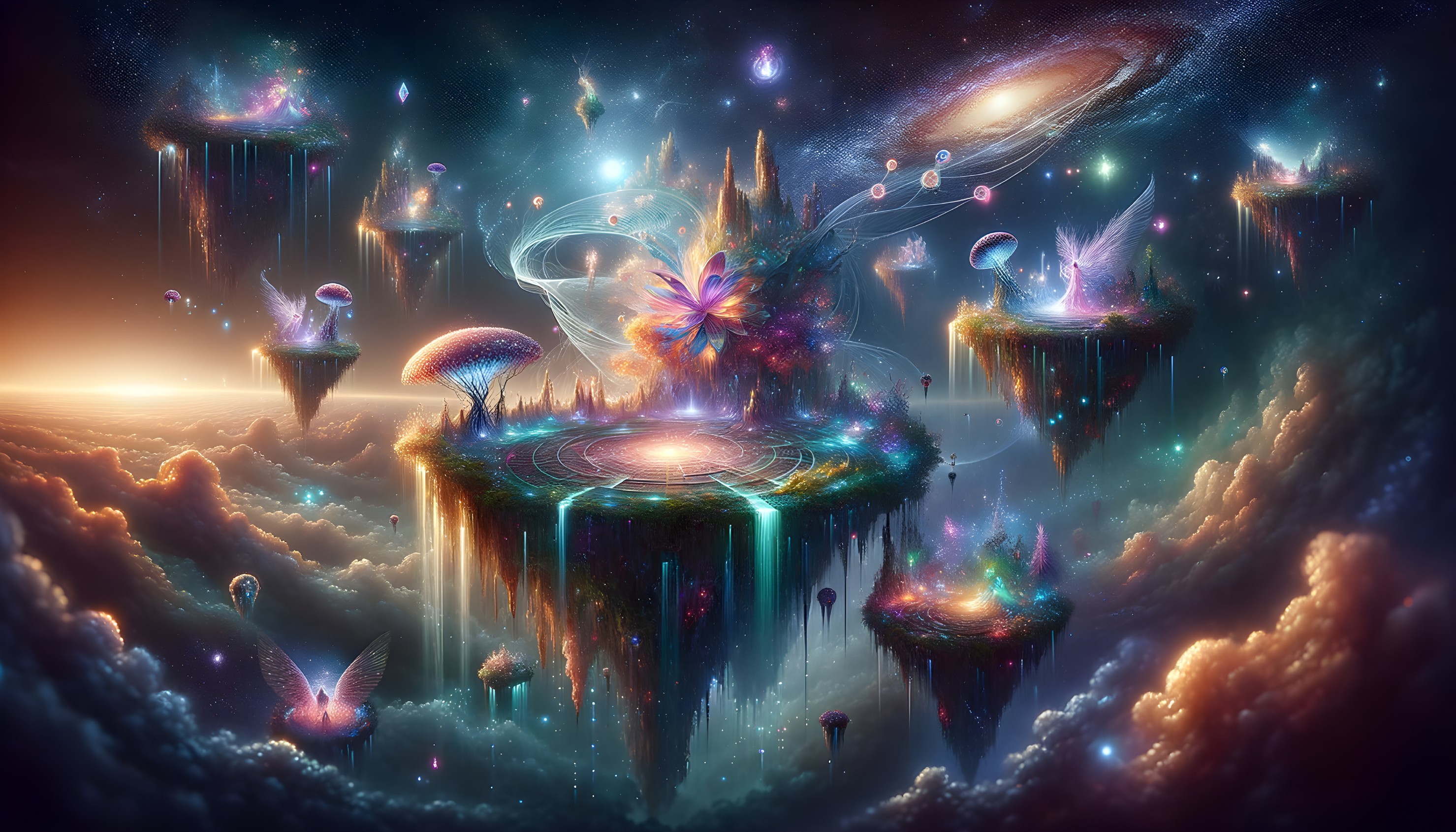 A mesmerizing digital artwork featuring a vivid cosmic landscape with surreal floating islands, glowing flora and fauna, ethereal beings, and mystical portals. The scene is brought to life with an iridescent color palette, enchanting lighting effects, and intricate details, creating an immersive and dreamlike atmosphere under starlit skies.