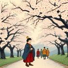 A serene scene depicting cherry blossom trees lining a cobblestone path, with distant mountains and a snowy peak. People in traditional clothing stroll, capturing the beauty of springtime in Japan.