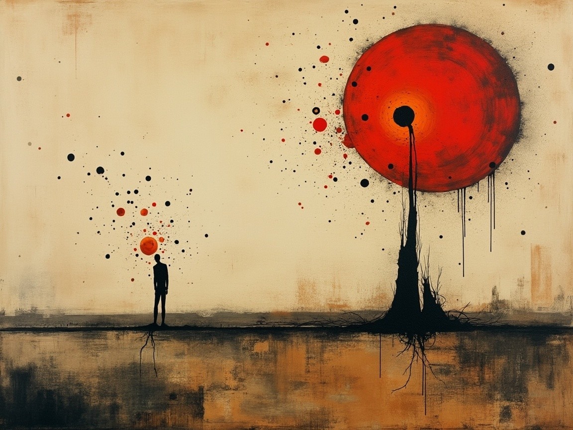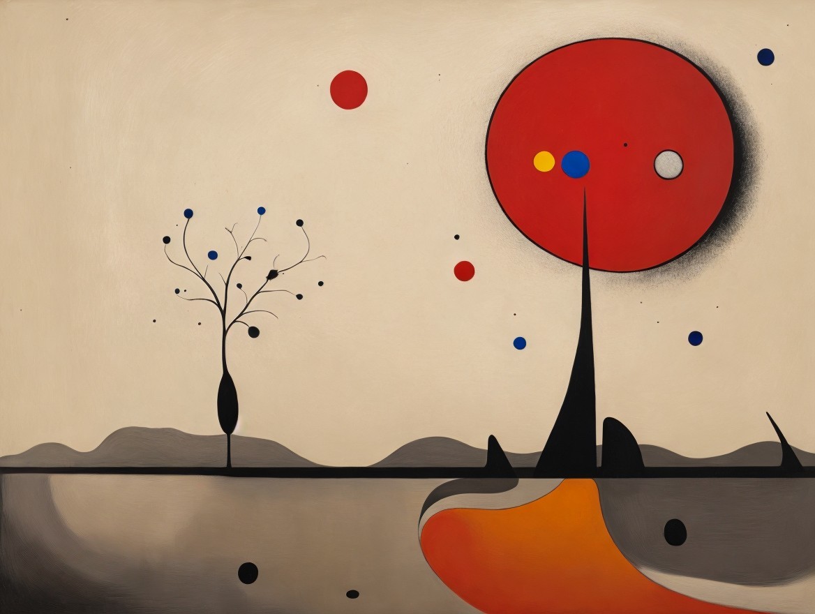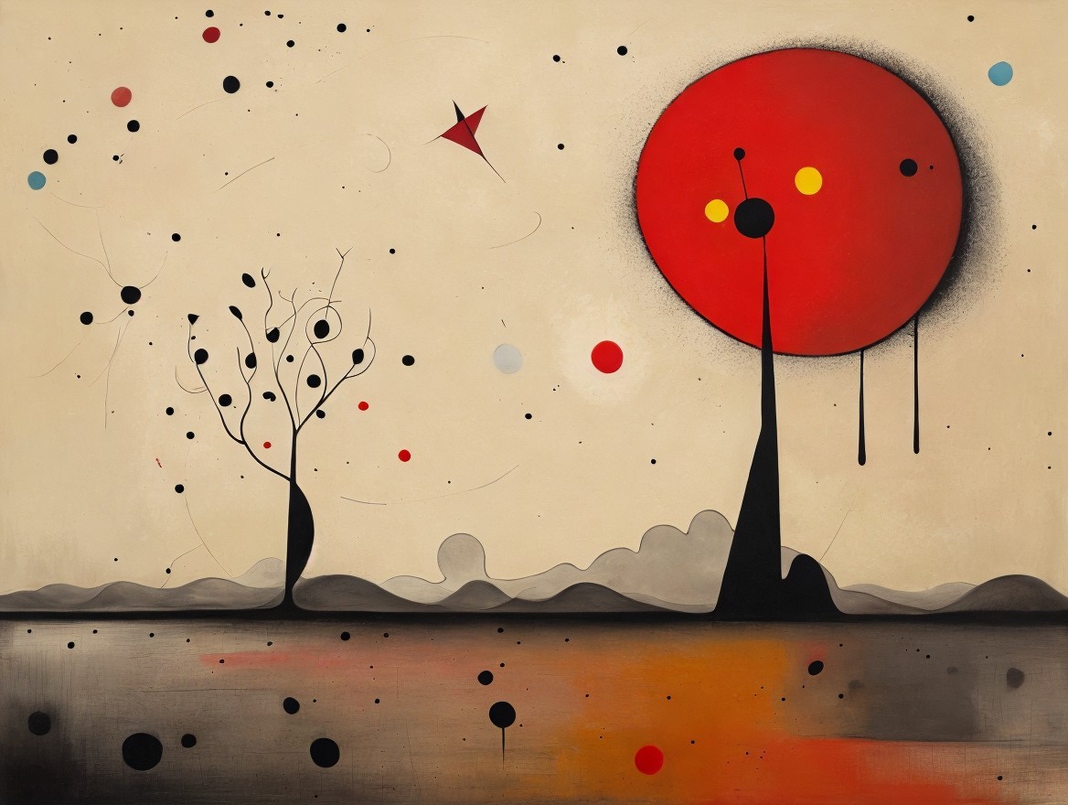 The artwork features a minimalist landscape with a large red sun, abstract trees, and colorful shapes on a muted background, creating a serene yet striking visual composition.