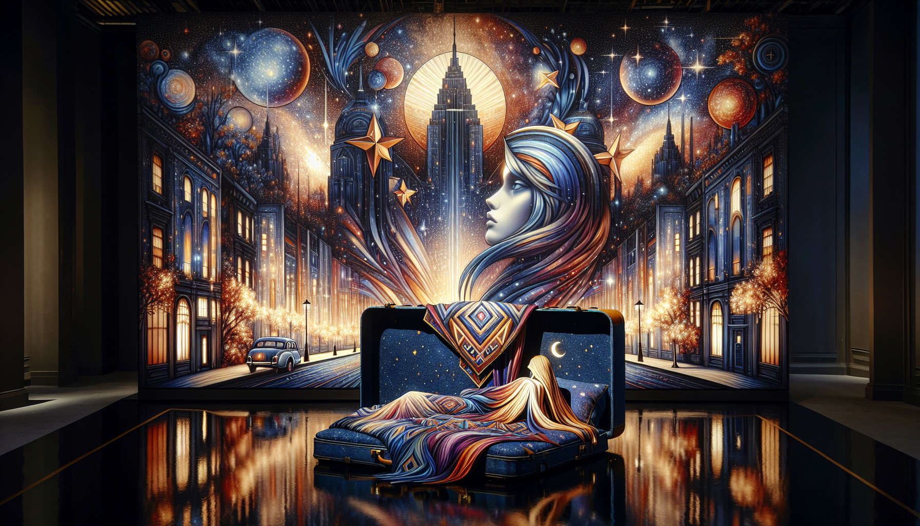 A surreal scene features a woman's face emerging from vibrant, flowing hair, intertwined with celestial elements. An elegant vintage car and art deco buildings enhance the dreamlike atmosphere.