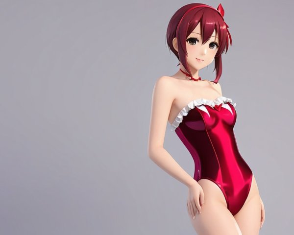 A charming anime character in a fuzzy strapless swimsuit, exuding playful energy and a vibrant personality. Her bright colors and cheerful expression capture a sense of summer fun and joy.