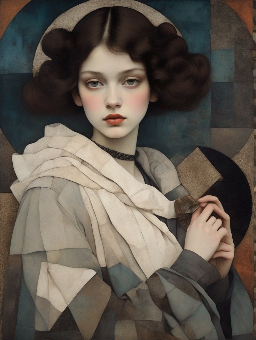A portrait of a woman with dark hair and a solemn expression, holding a cup, draped in a beige shawl against a moody, blue-toned backdrop.