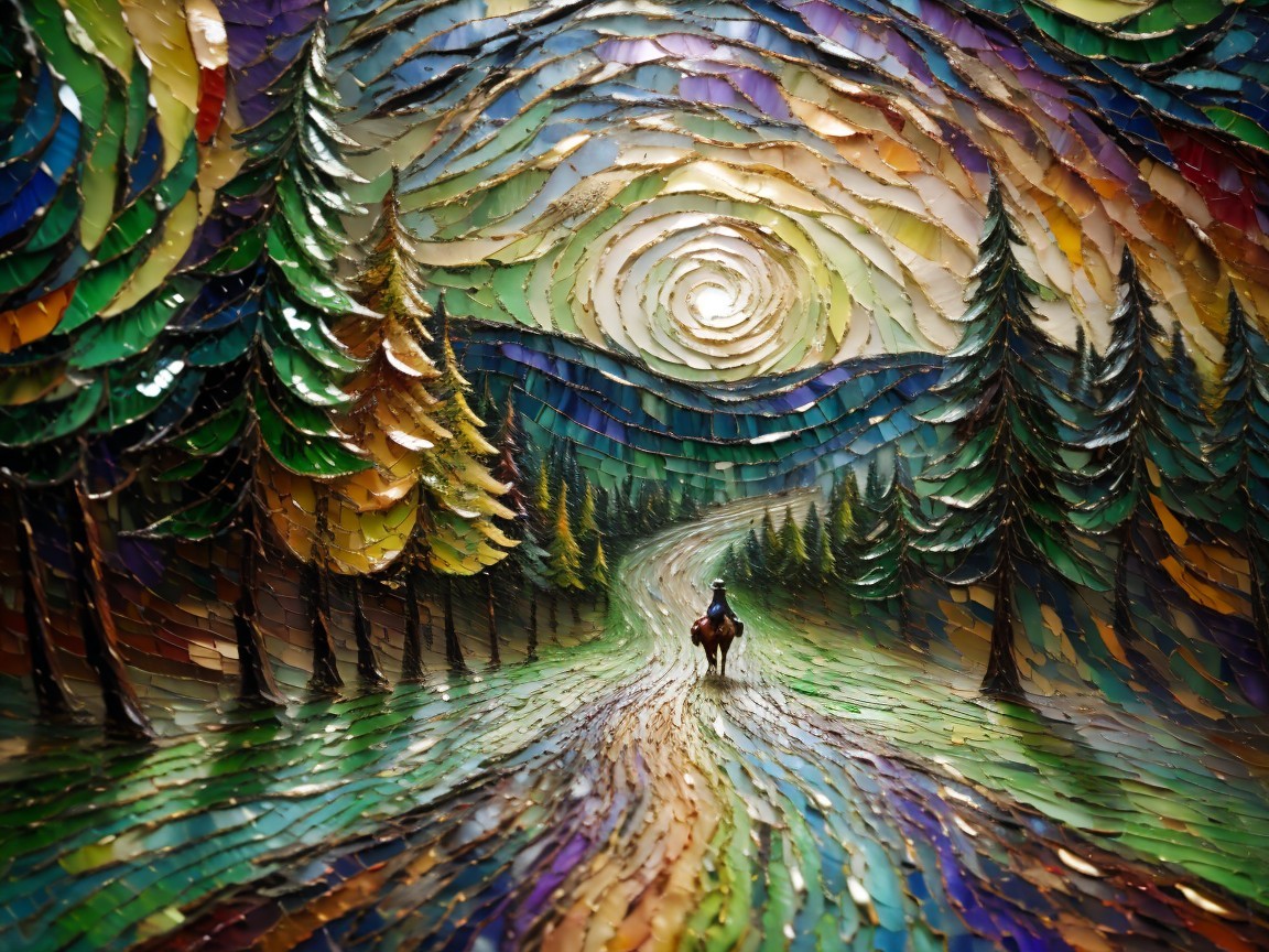 A vibrant, textured landscape features a majestic horse made of colorful layers, surrounded by tall, green trees, winding paths, and a sky filled with swirling hues of blue and green.