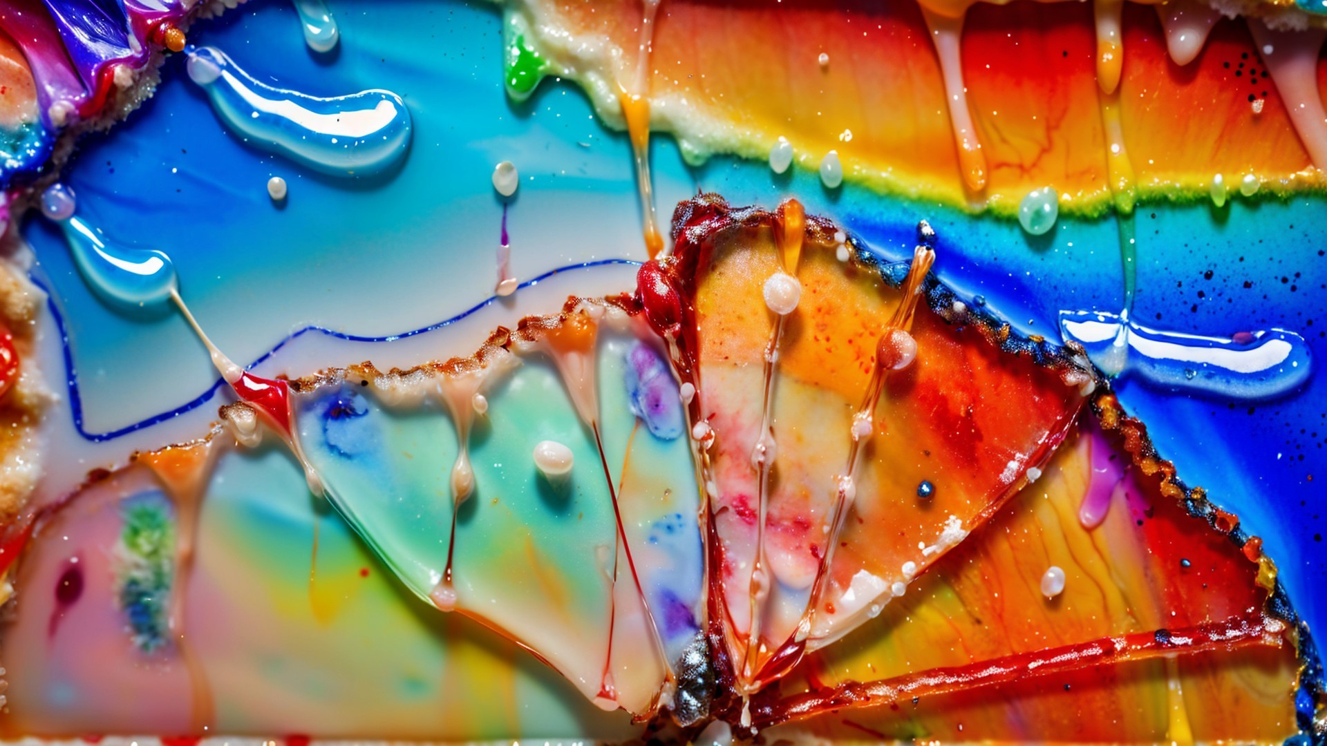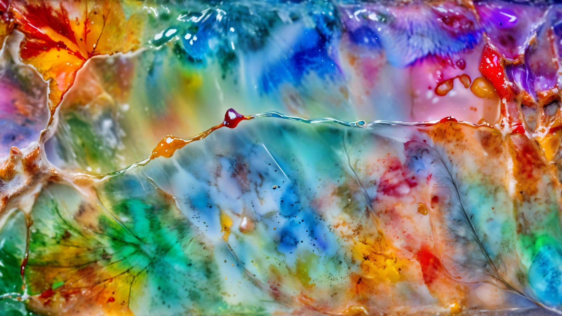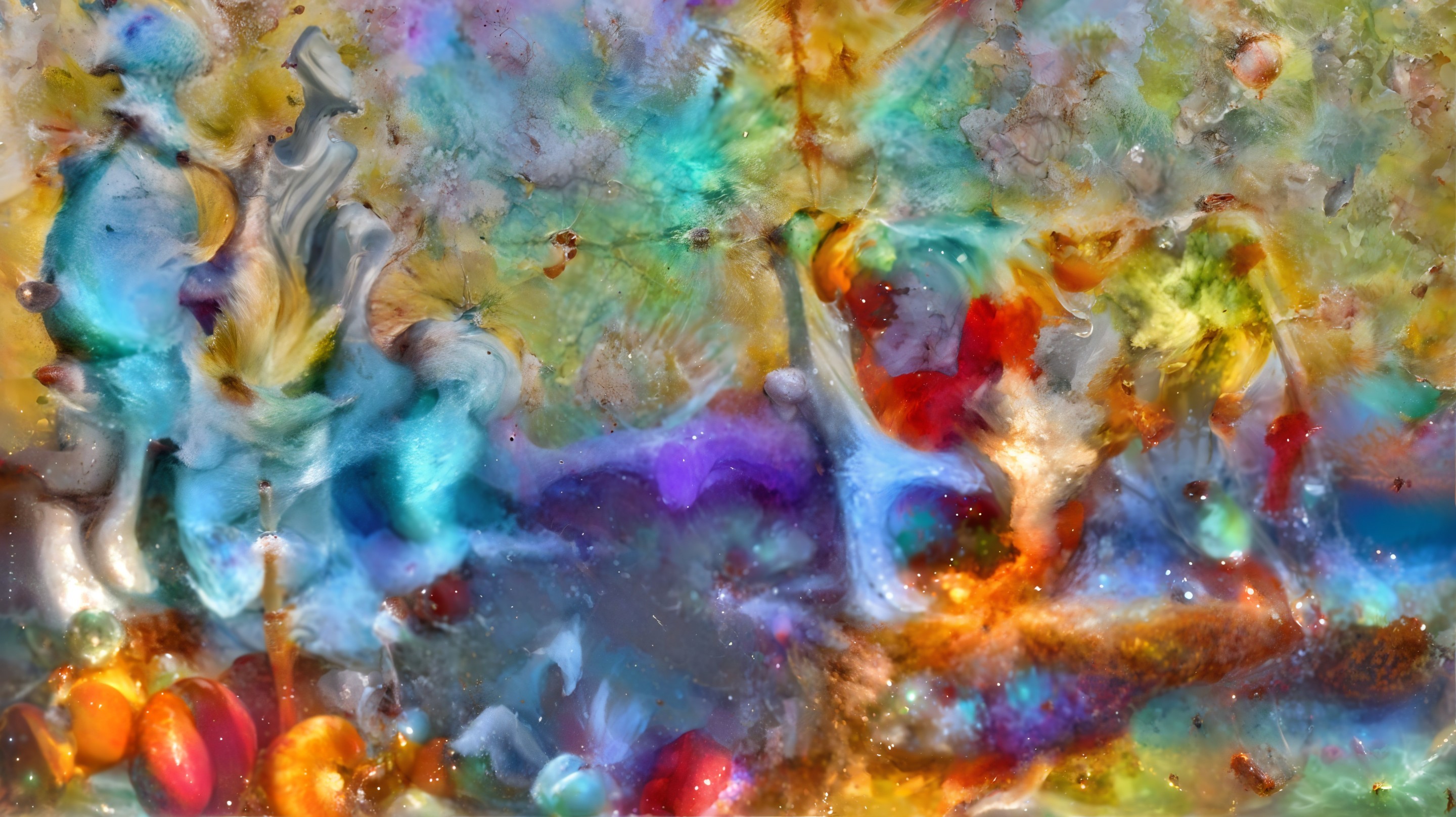 A vibrant, abstract landscape of swirling colors in blue, rainbow shades, and bubbles, resembling a dynamic fluid surface. The interplay of hues creates a mesmerizing visual effect.