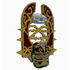The image features an ornate shield design with a dragon's head at the base. The shield is adorned with spikes and a central gear-like motif, highlighted by deep red and gold colors, exuding a fierce aesthetic.