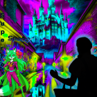 A vibrant digital scene showcases a neon-lit street with a silhouetted figure meditating in front of a whimsical castle. A playful, green-haired character stands confidently, adding to the fantasy vibe.