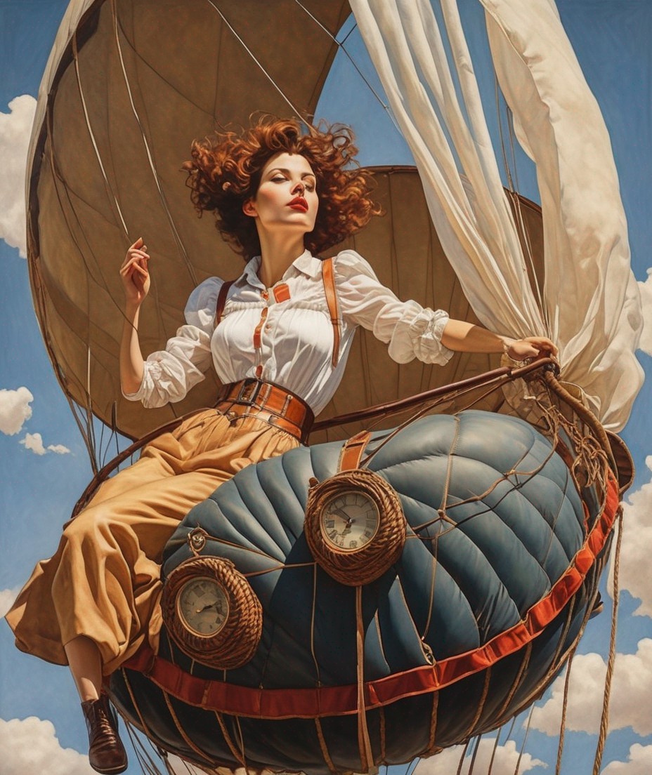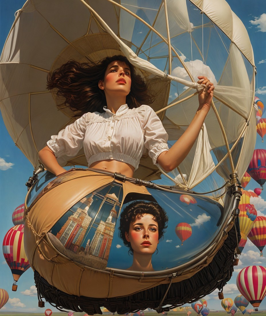 A woman in vintage attire sits on the edge of a hot air balloon basket high in the sky, surrounded by other balloons.
