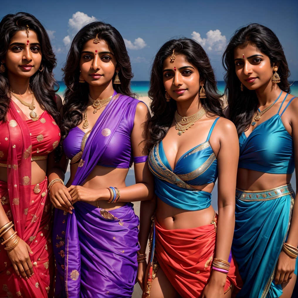 Four women in colorful traditional Indian attire posing on a beach with clear blue skies.