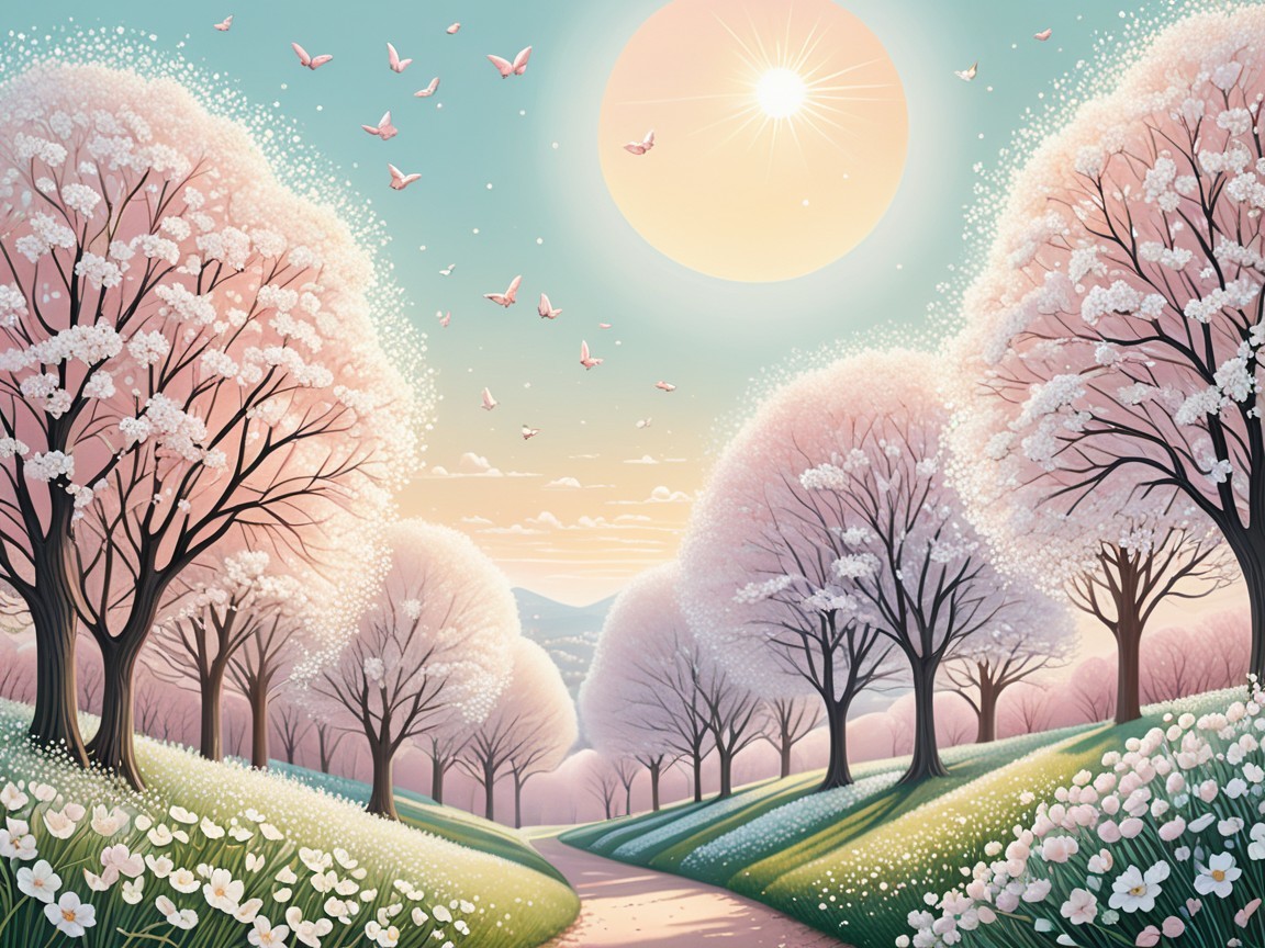 A serene landscape featuring blooming cherry blossom trees and lush greenery, bathed in warm sunlight. Colorful butterflies flutter above a gentle pathway lined with vibrant flowers.