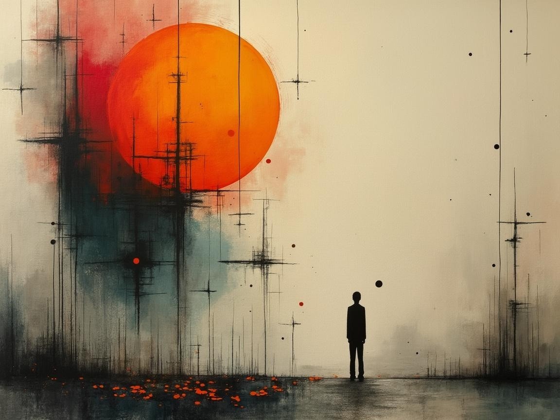 A surreal landscape features a lone figure against a backdrop of vibrant, abstract planets and glowing orbs, blending shades of orange, black, and soft pastel tones, evoking a sense of cosmic wonder.