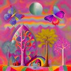A vibrant, surreal landscape featuring colorful trees with round canopies, rolling hills, and a large, radiant sun. The palette of pinks, purples, and blues creates a dreamlike atmosphere.