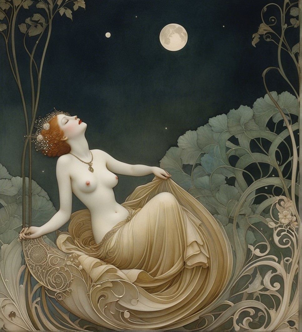 A serene figure in an elegant gown stands gracefully, holding a decorative pot on a platter. Surrounded by intricate floral motifs, her ethereal beauty is accentuated by subtle colors against a dark background.