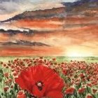 Vibrant Red Poppies Against a Pastel Sunset Landscape