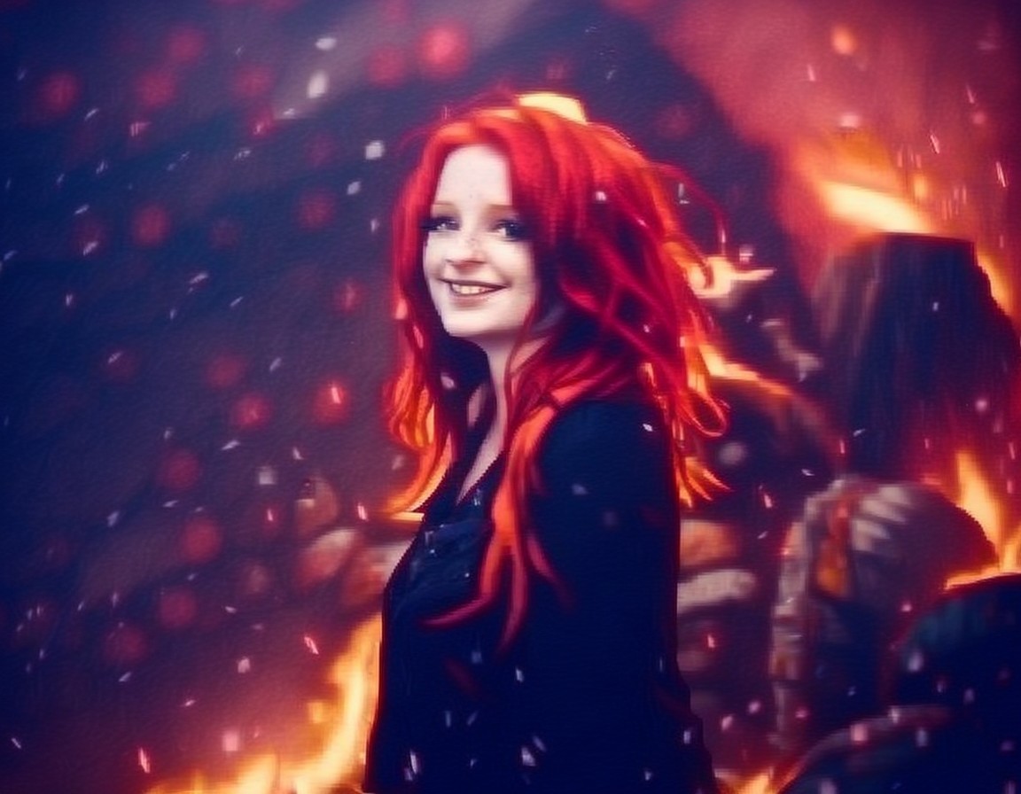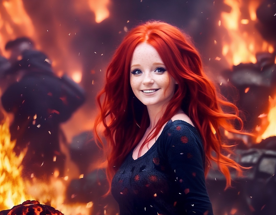 A smiling woman with vibrant red hair and a navy dress stands before a backdrop of intense flames.