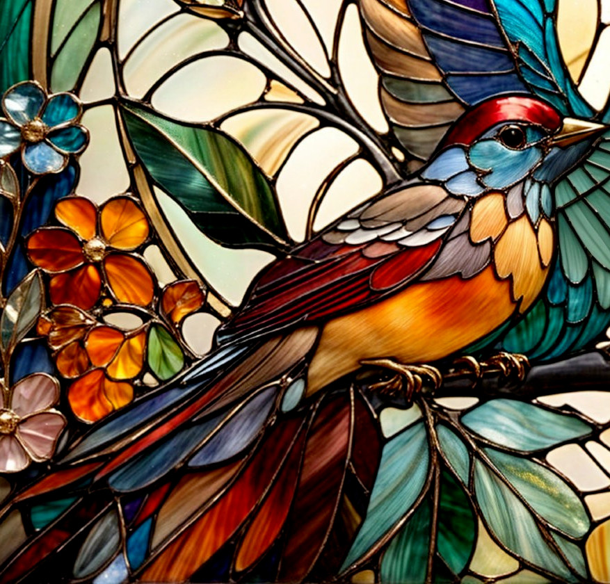 A graceful woman in a vibrant red kimono poses elegantly, adorned with colorful feathered wings and floral accents, set against a luminous stained glass backdrop depicting nature.