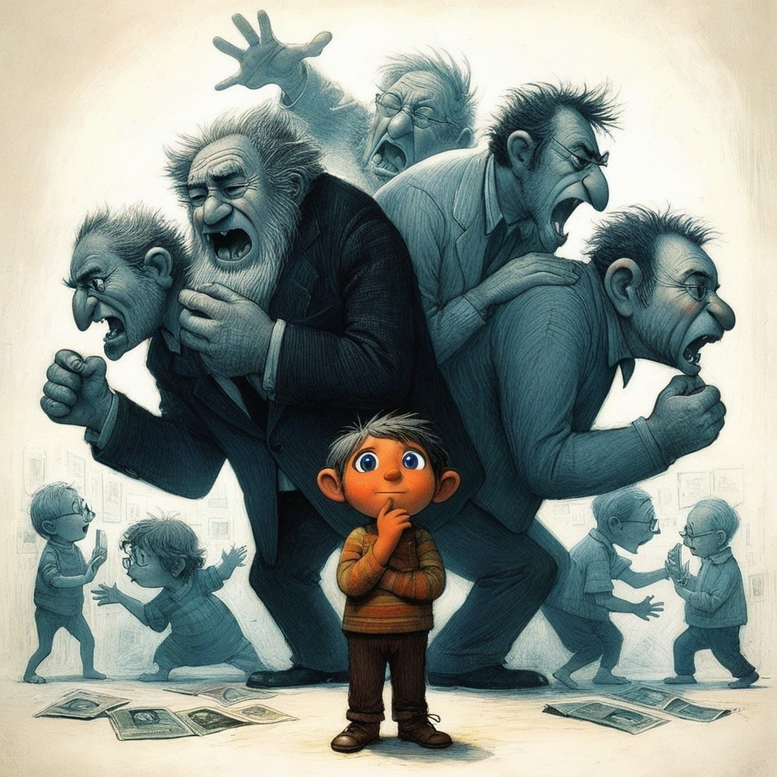 A thoughtful child stands at the forefront, surrounded by angry, elderly figures expressing frustration, while shadowy silhouettes of other children depict chaos in the background.