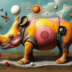 A whimsical, surreal painting of a rhinoceros adorned with colorful patterns and abstract shapes, set in a dreamy landscape with floating celestial objects and a butterfly.