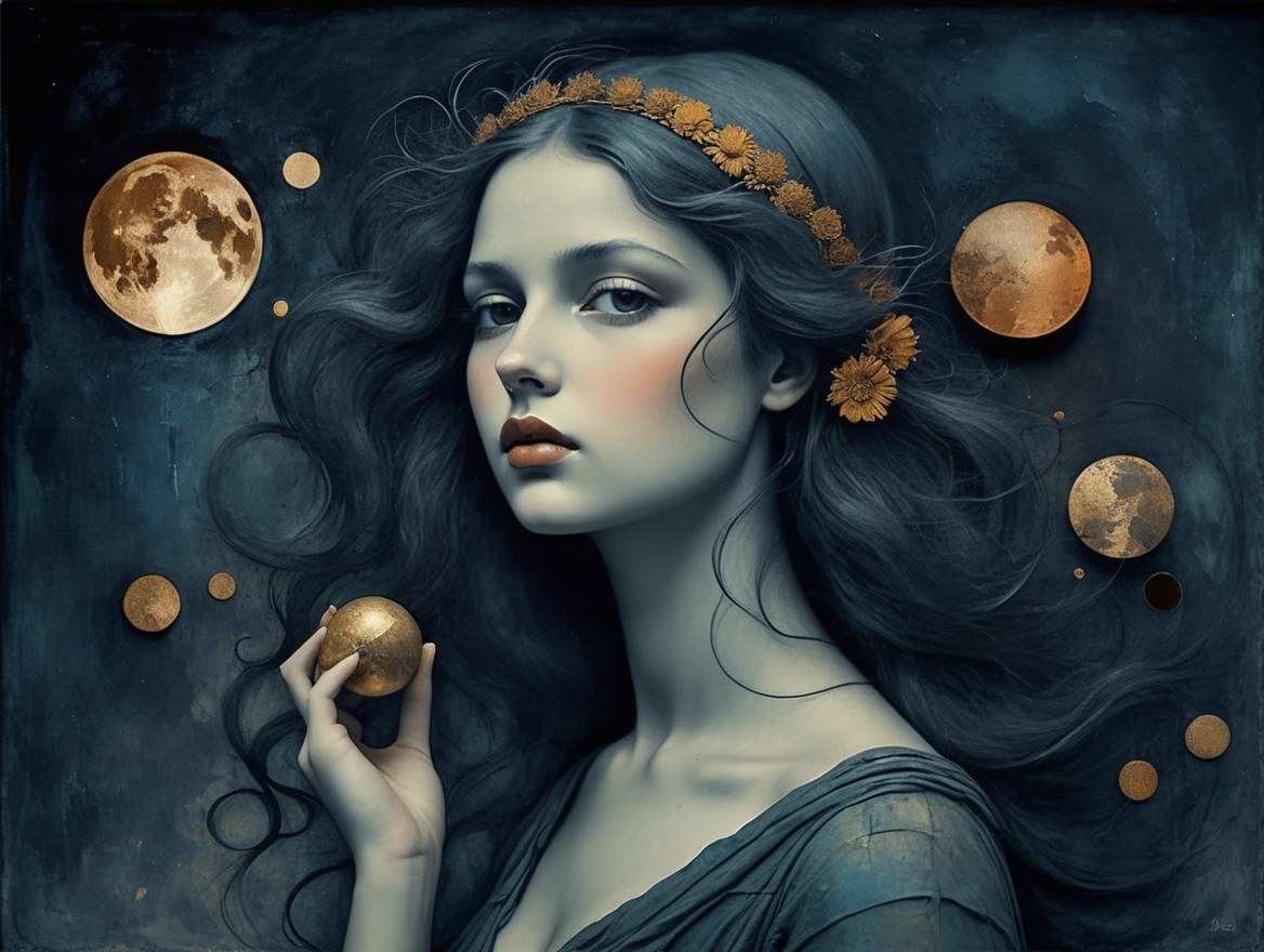 A mystical portrait of a woman with a leaf crown, holding a small fruit, surrounded by glowing orbs and autumn leaves against a dark backdrop.
