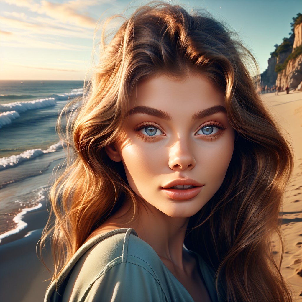 A close-up portrait of a young woman with long, wavy hair and striking blue eyes, set against a picturesque beach background with gentle waves and a serene sky.