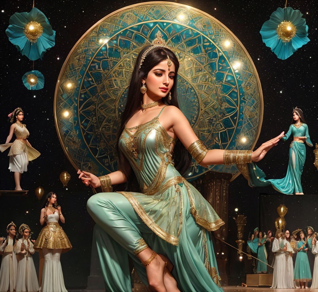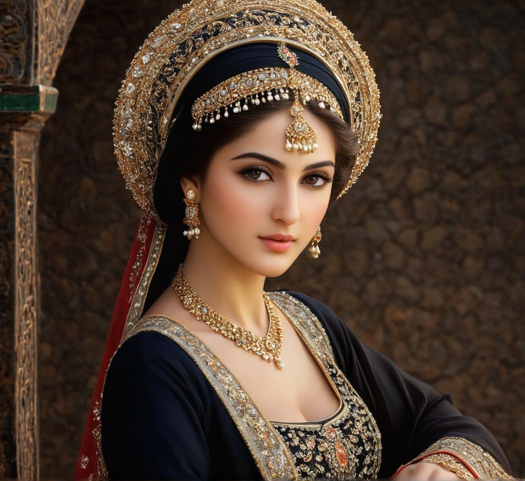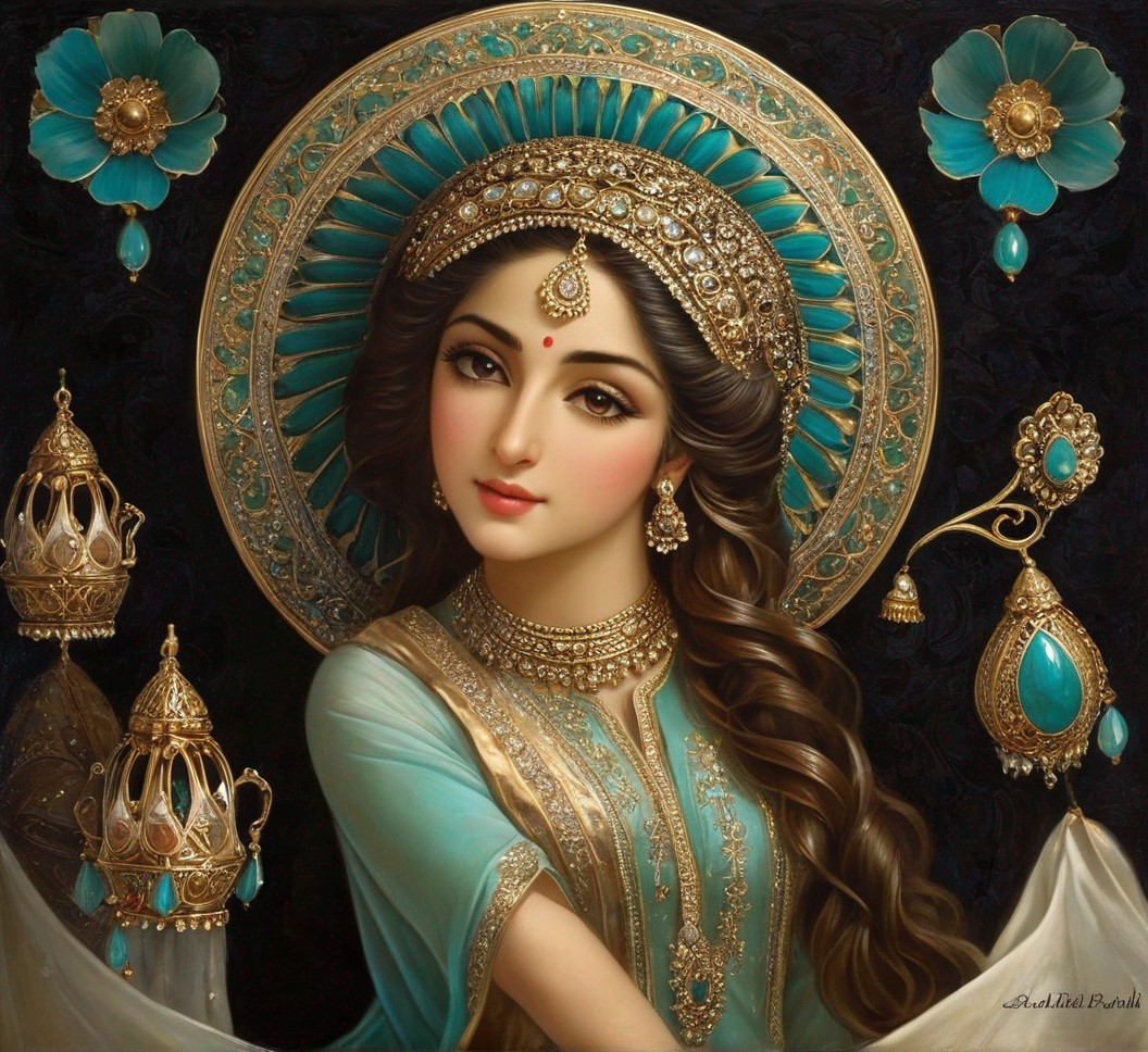 A woman with a blue headscarf, traditional jewelry, and striking makeup stands before an ornate blue background.