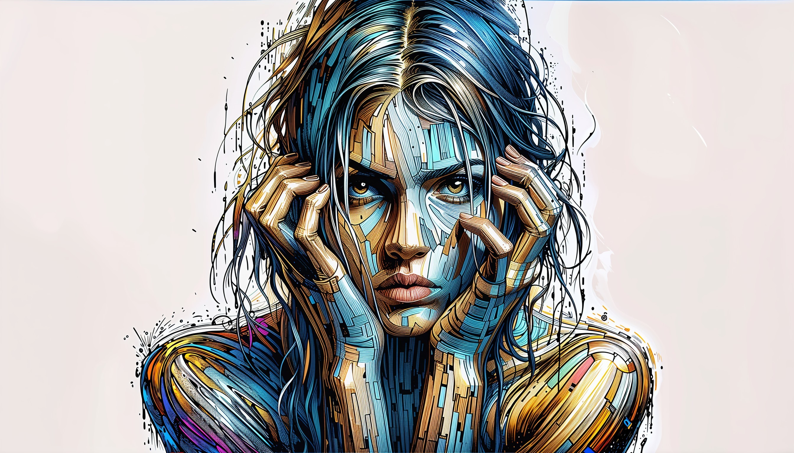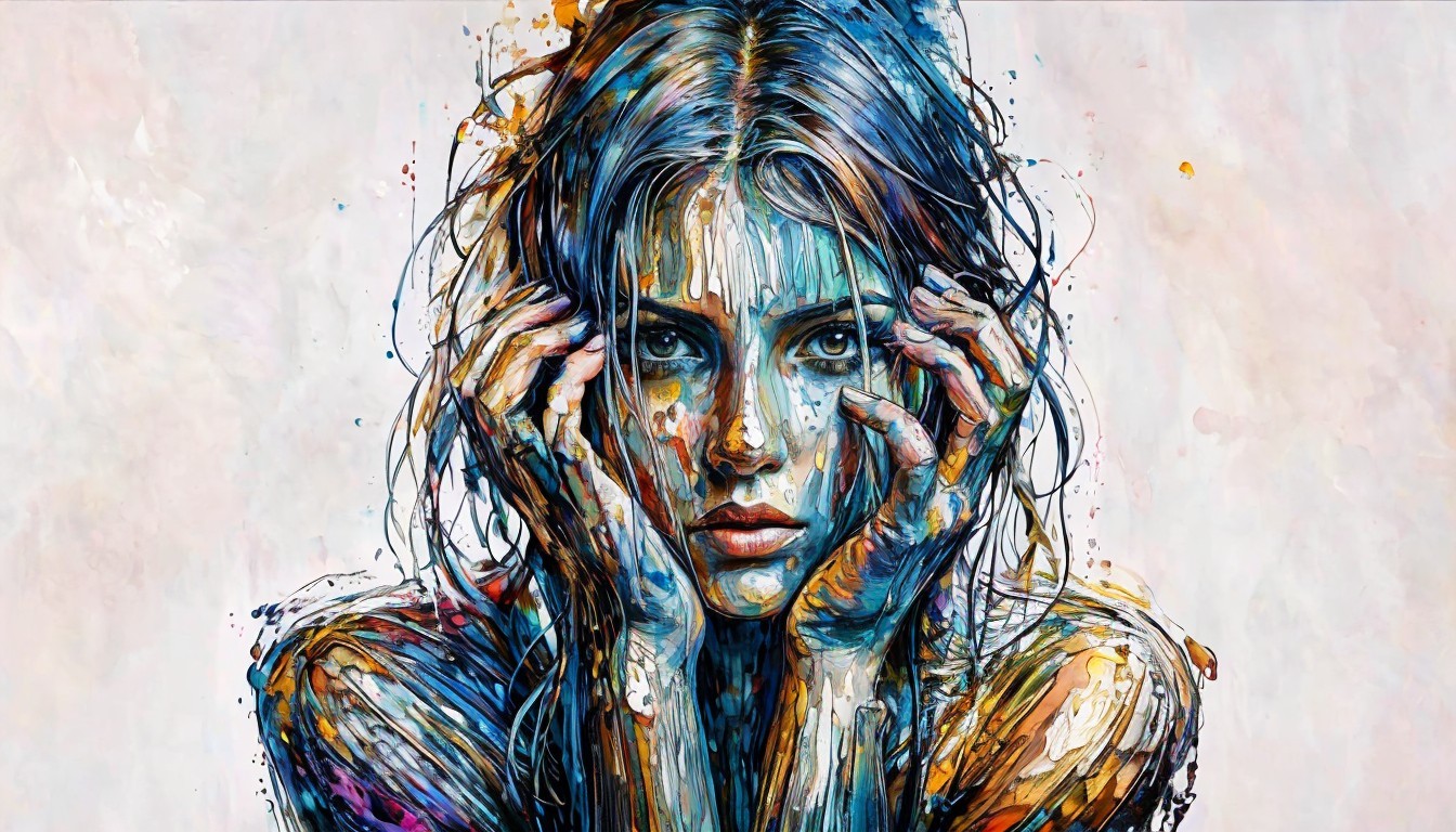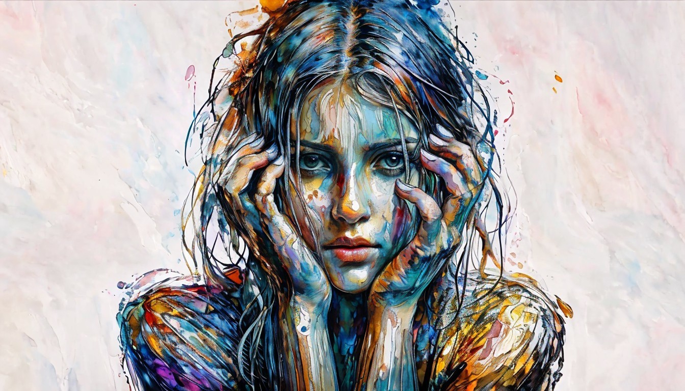 A striking portrait of a young woman with expressive eyes, her hands framing her face. The artwork features vibrant colors and fluid brushstrokes, conveying deep emotion and introspection.