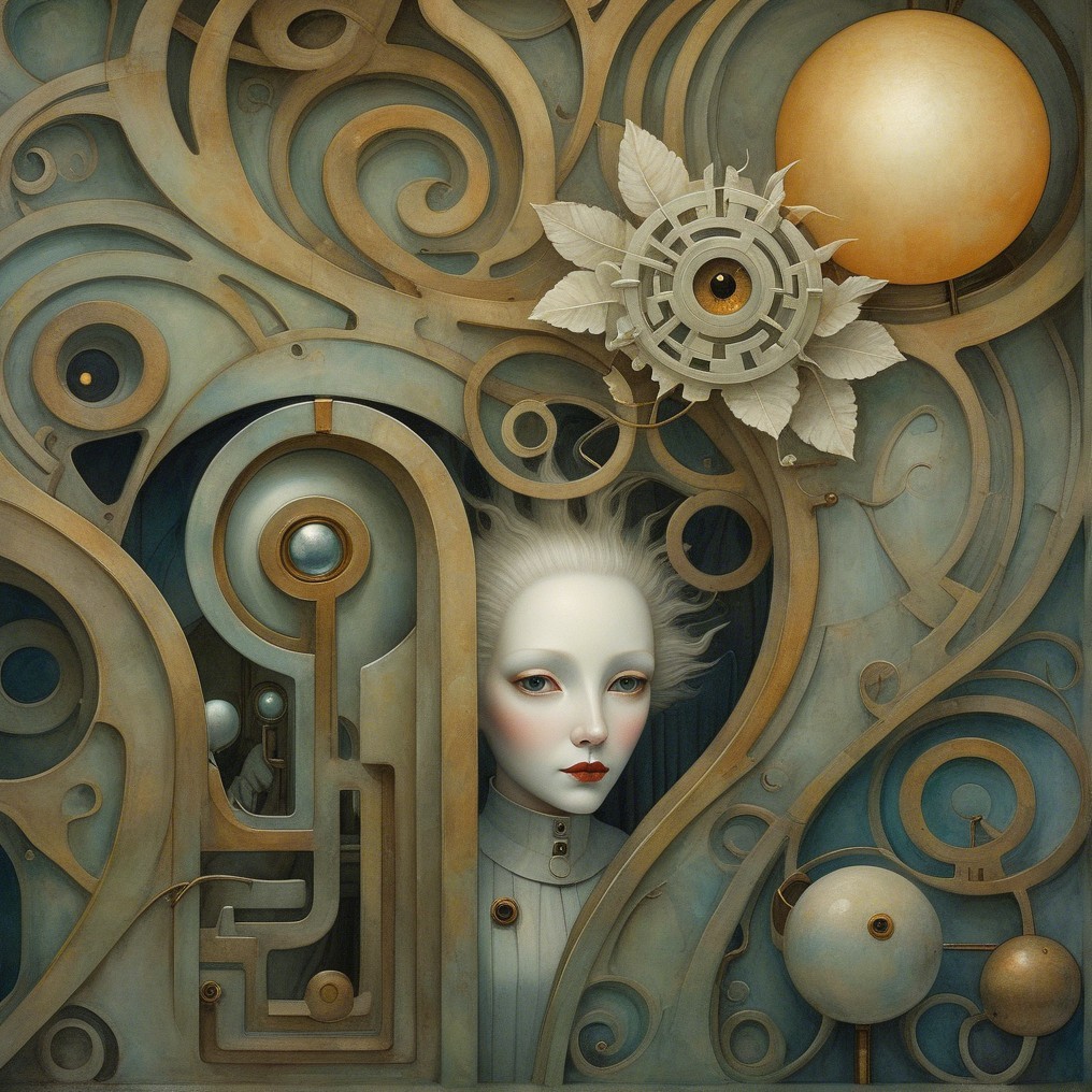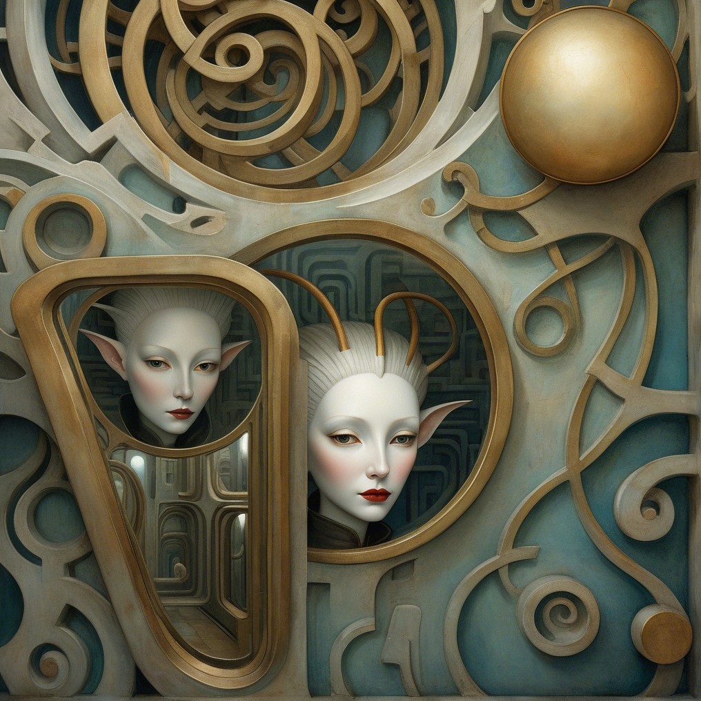 Close up, impish mischievous gorgeous white face creature with a staring into a mirror in a futuristic maze, in the style of Alexander Jansson. by Catrin Welz-Stein, Michael Parkes. By Rob Gonsalves, Markus Pierson. Bronze tones.