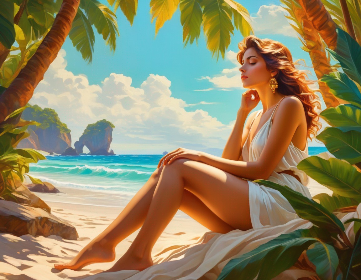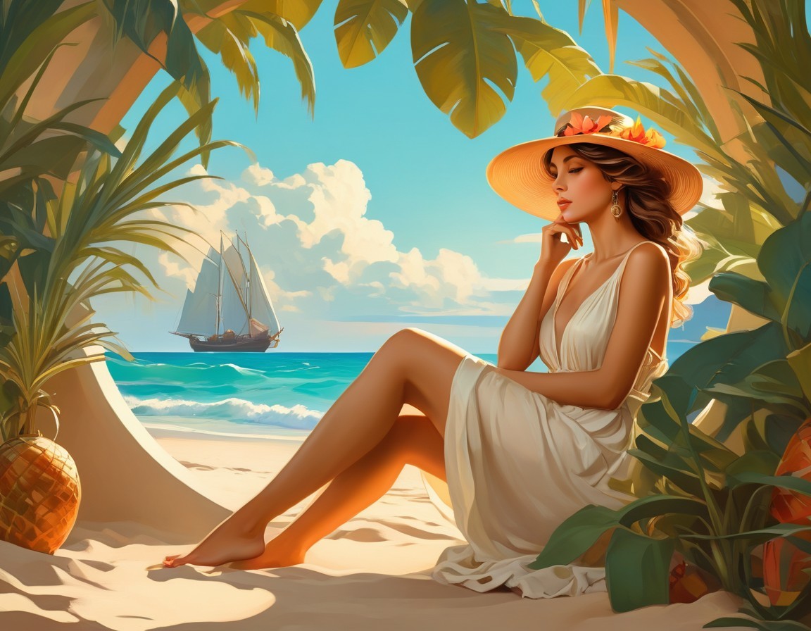 A relaxed dog lounges on a sandy beach surrounded by palm trees, with a vibrant blue ocean and a boat in the distance under a sunny sky. Perfect tropical paradise vibes!