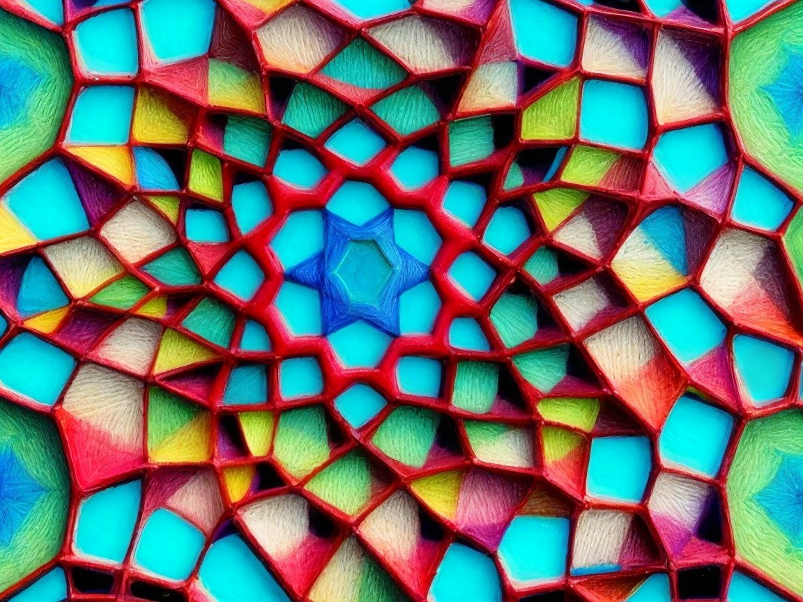 The image features a vibrant, intricate pattern of interlocking shapes in various colors, set against a turquoise background, creating a mesmerizing kaleidoscopic effect.