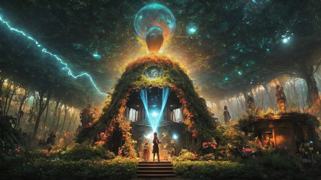 A mystical forest setting with glowing symbols, a central figure on stairs, flanked by large faces, all beneath an ethereal, haloed entity.