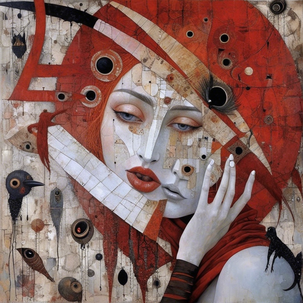 The image features two stylized female faces intertwined, with bold red accents and geometric patterns. Their expressions are serene, highlighting a blend of abstraction and emotion. Original Prompt: Susanne