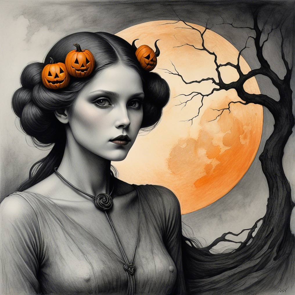 A mysterious figure with dark, flowing hair stands against a striking orange moon. A bat flies overhead, adding an eerie atmosphere to the haunting scene.