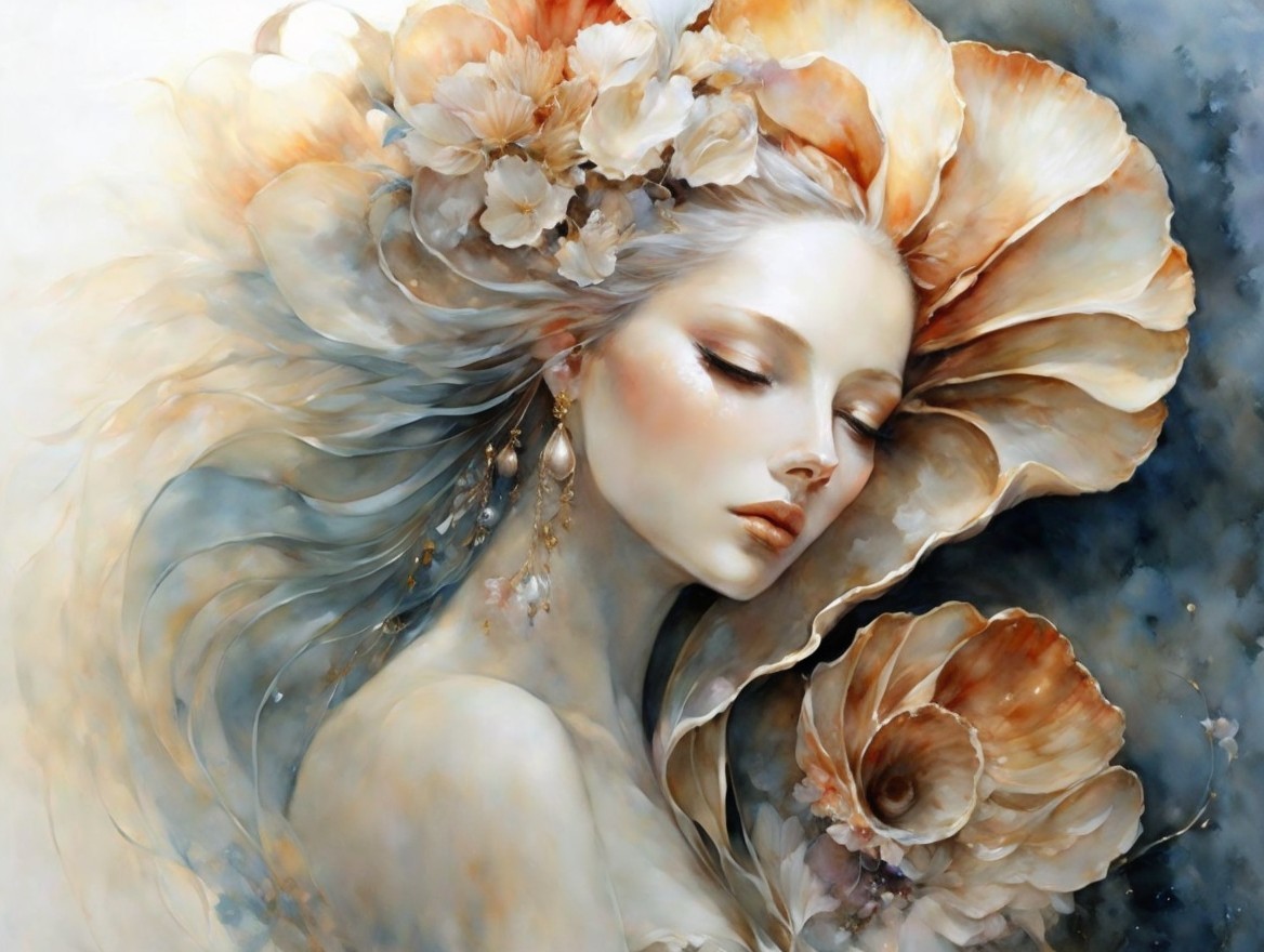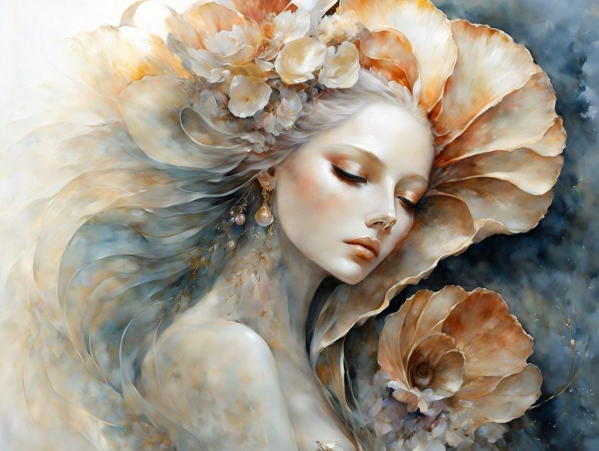 An ethereal painting of a woman with large, blooming flowers in her hair, in soft, warm tones, exuding a serene, dreamlike quality.