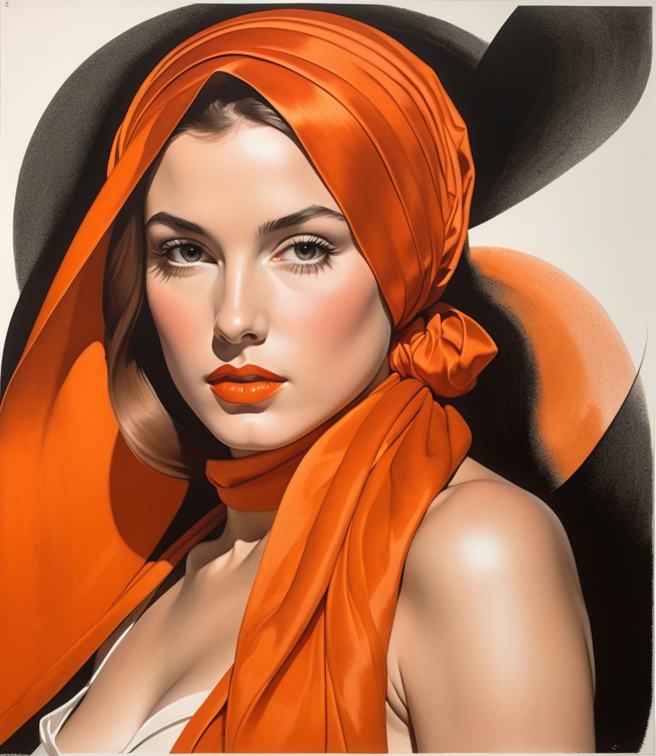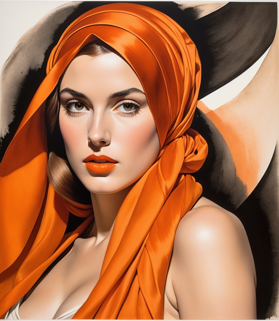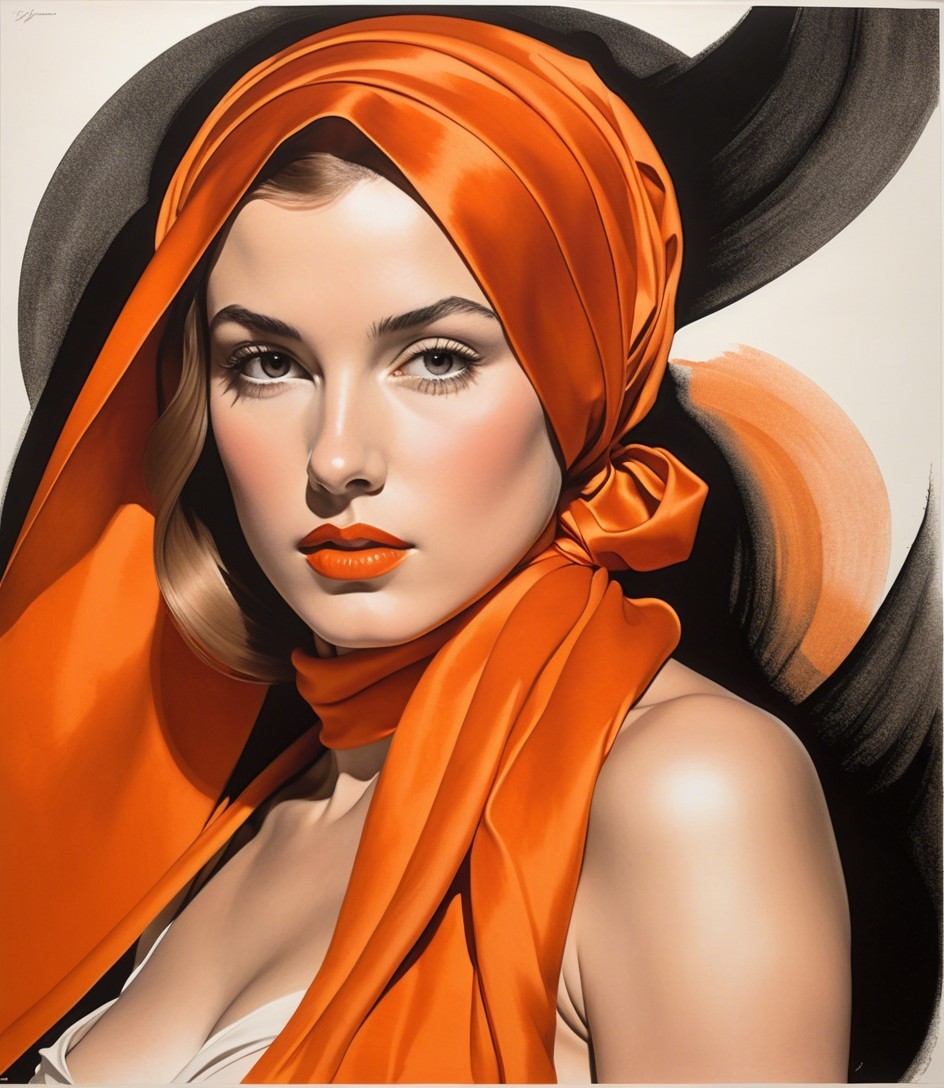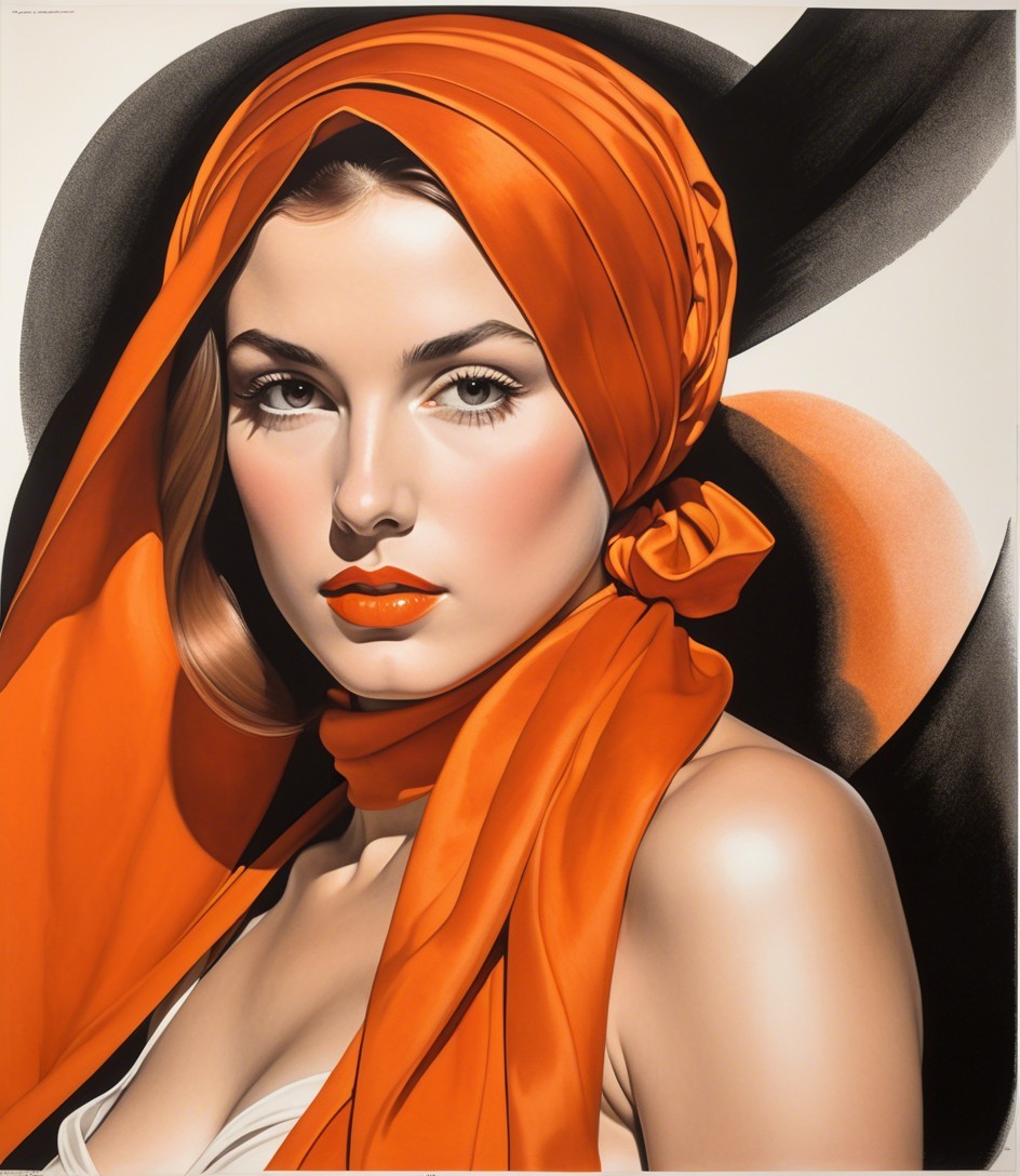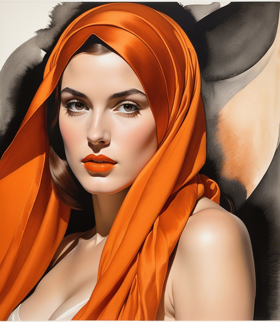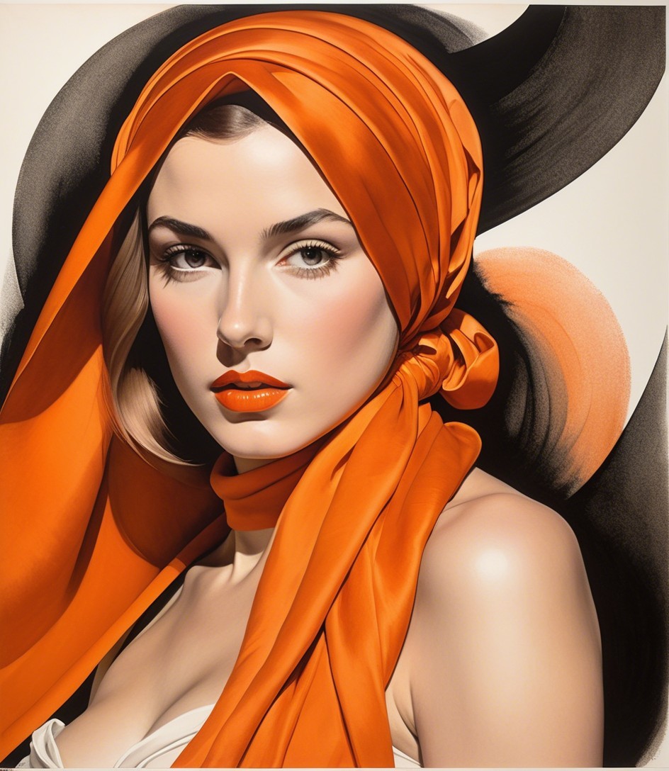 A striking portrait of a young woman with a bold orange scarf. Her captivating gaze and vibrant lips contrast beautifully with soft, blurred backgrounds, showcasing elegance and charm.