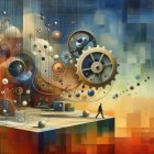 A surreal scene depicting a man in formal attire pulling a large blue globe up a colorful ramp, flanked by whimsical buildings and celestial orbs against a vibrant sky.