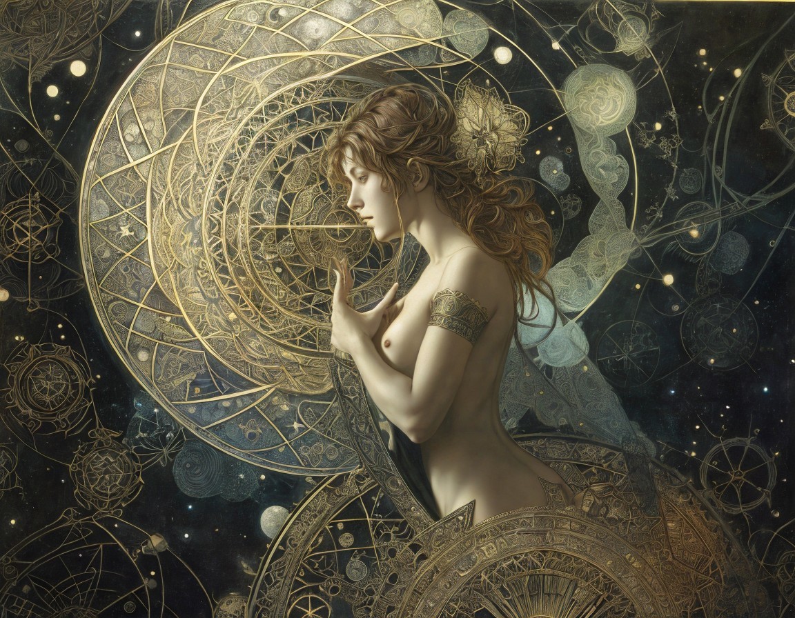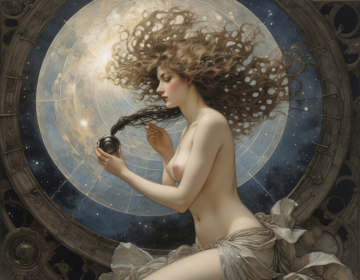 A serene figure with flowing hair gazes thoughtfully against a backdrop of a large, luminous moon, embodying a blend of ethereal beauty and tranquil mystique.