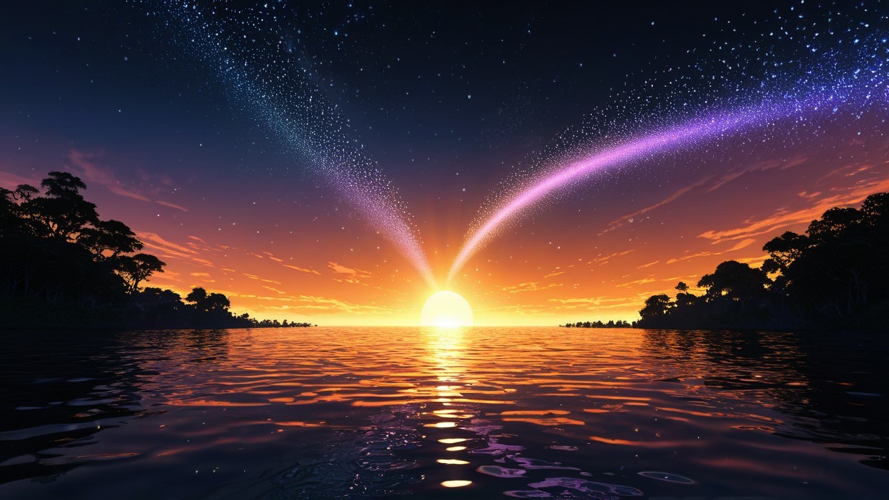 A breathtaking sunset reflects on calm waters, with vibrant orange and purple hues. Two cosmic trails of stars arc across the sky, enhancing the tranquil beauty of the scene.
