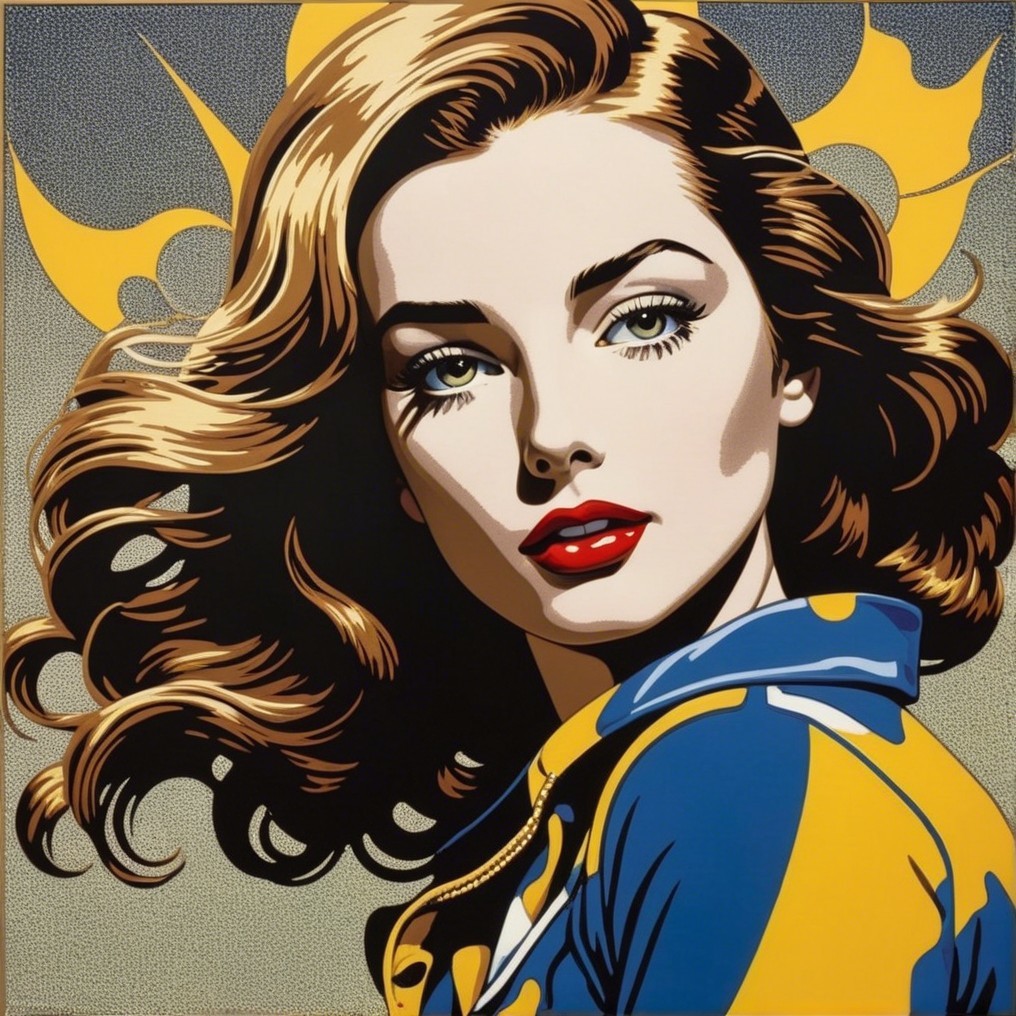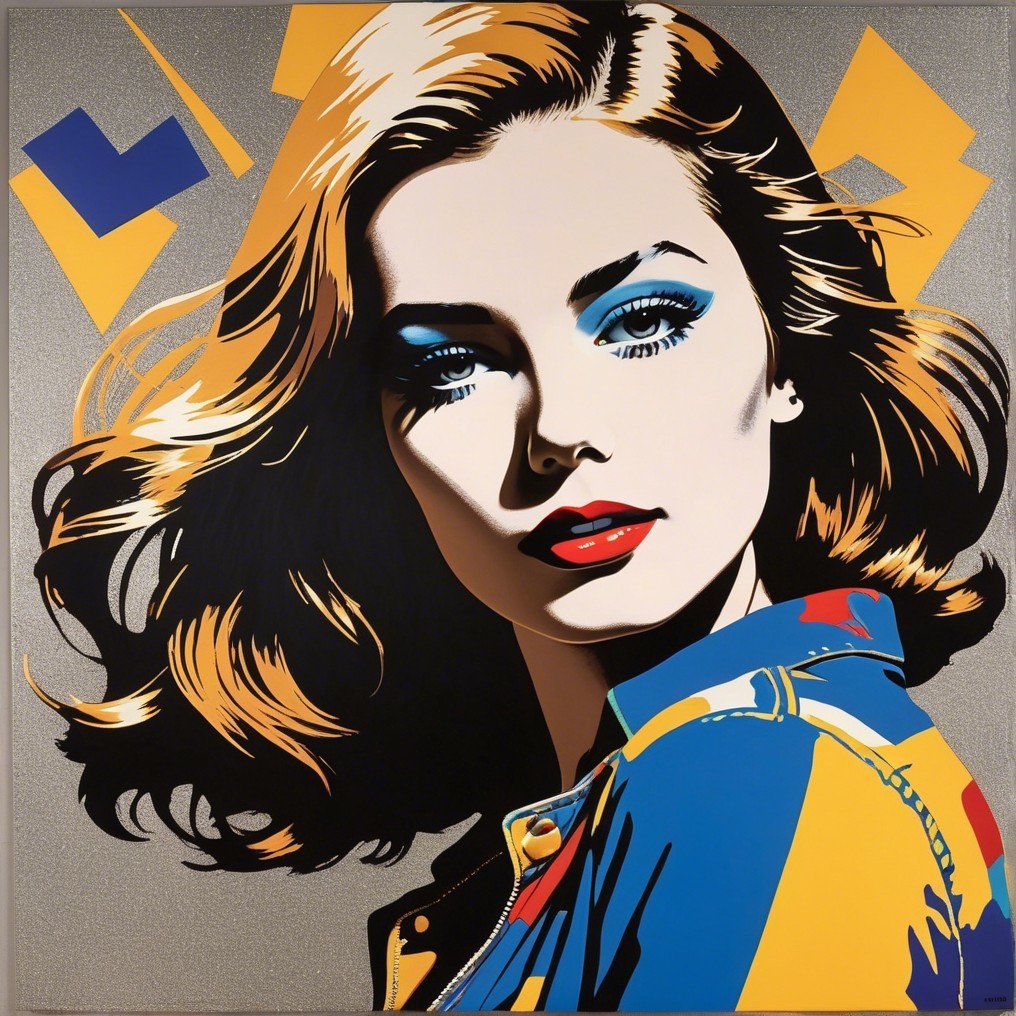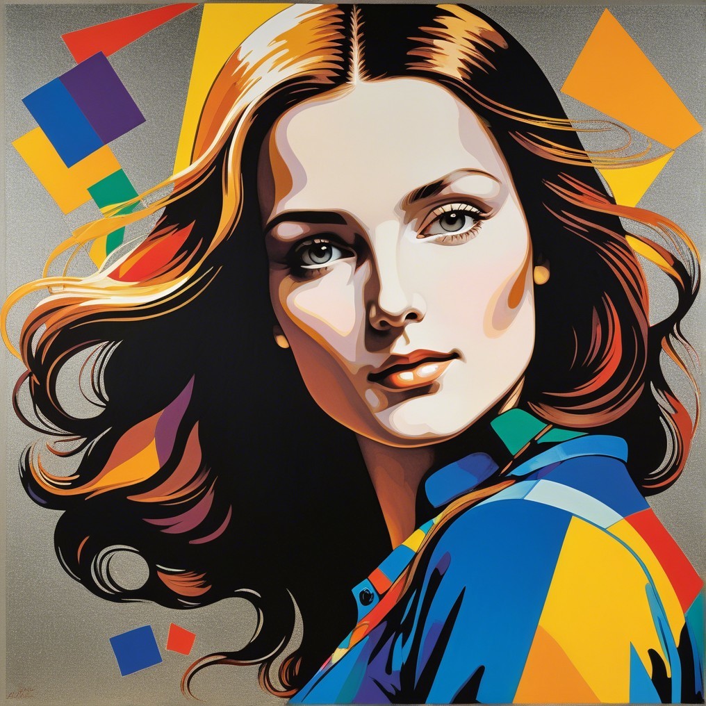A vibrant, pop art portrait of a young woman with flowing hair, striking features, and bold colors. Geometric shapes surround her, creating a dynamic, energetic composition.