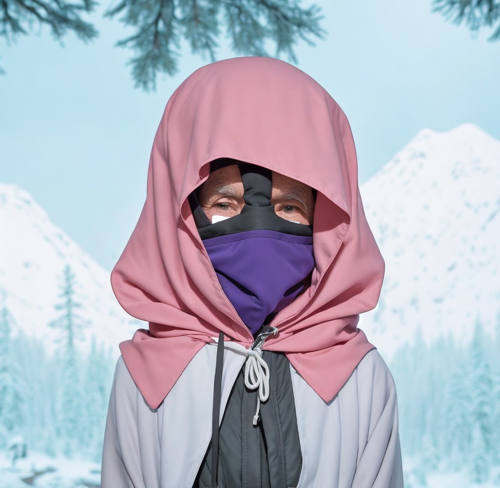 A hooded, masked, blind, robed traveler In his late 50s walks peacefully through a wintry, empty forest village in a cold, mountainous country; A large town hall building is nearby. All is well preserved; the people are just... gone. His hands are folded over his chest, a few wisps of long white hair showing under his hood.