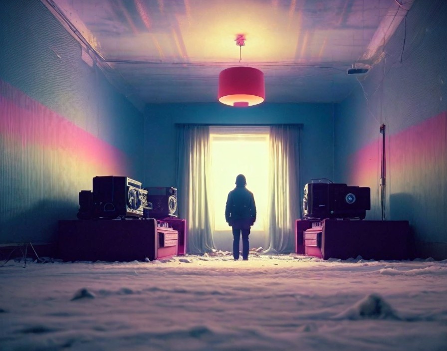 Person in Snow-Filled Room with Speakers and Hanging Lamp