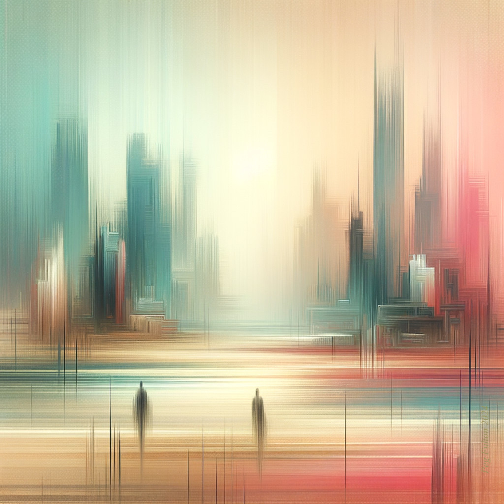 Abstract, blurred cityscape with warm hues and indistinct silhouettes of people and skyscrapers, conveying movement and urban vibrancy.