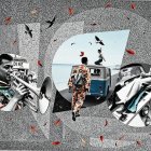 The image features a surreal collage with a textured, colorful background. It includes two portraits, one of a man in a suit and another of a historical figure, alongside a striking church silhouette.