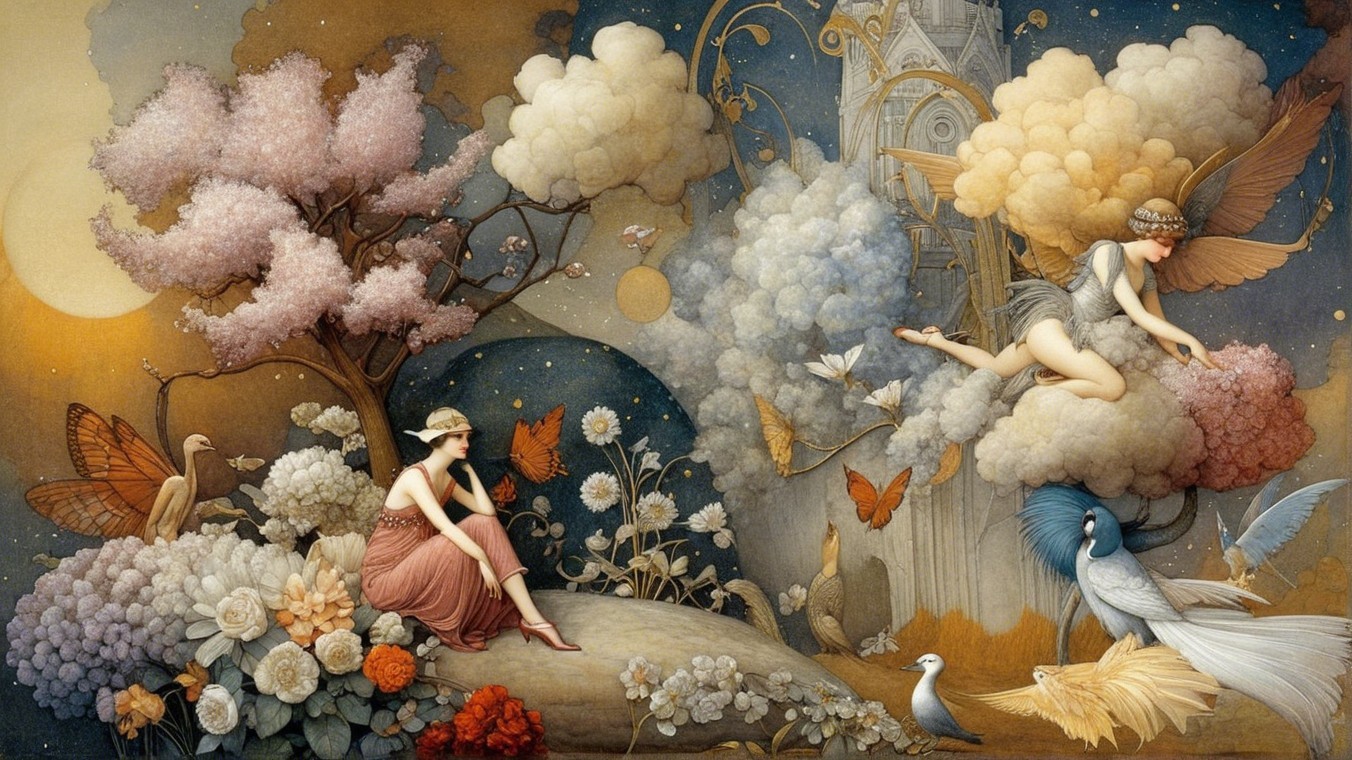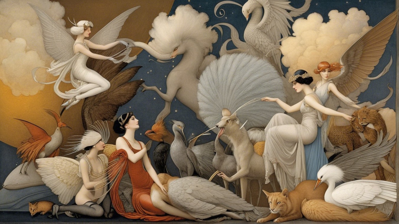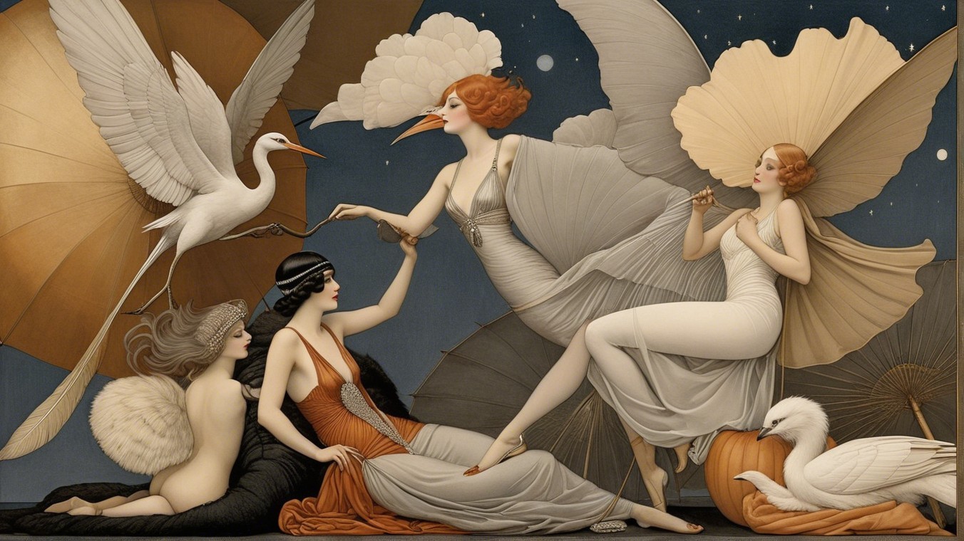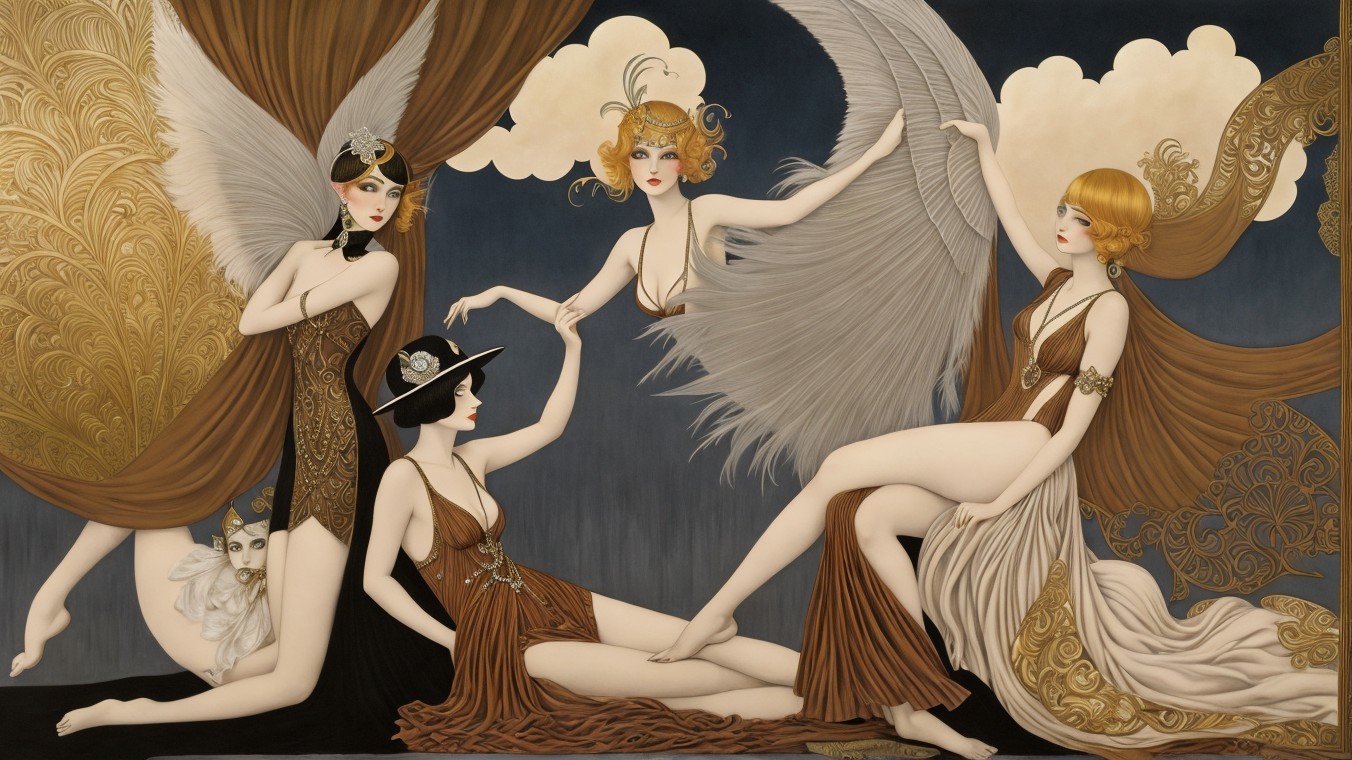 The image features four elegant women in 1920s attire, adorned with intricate wings and accessories. They exude glamour and mystique against a backdrop of soft clouds and a starry night.