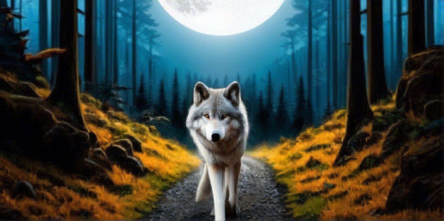 A majestic wolf walks along a forest path illuminated by a full moon. Tall trees surround the scene, and golden grass adds warmth to the cool, moonlit atmosphere.