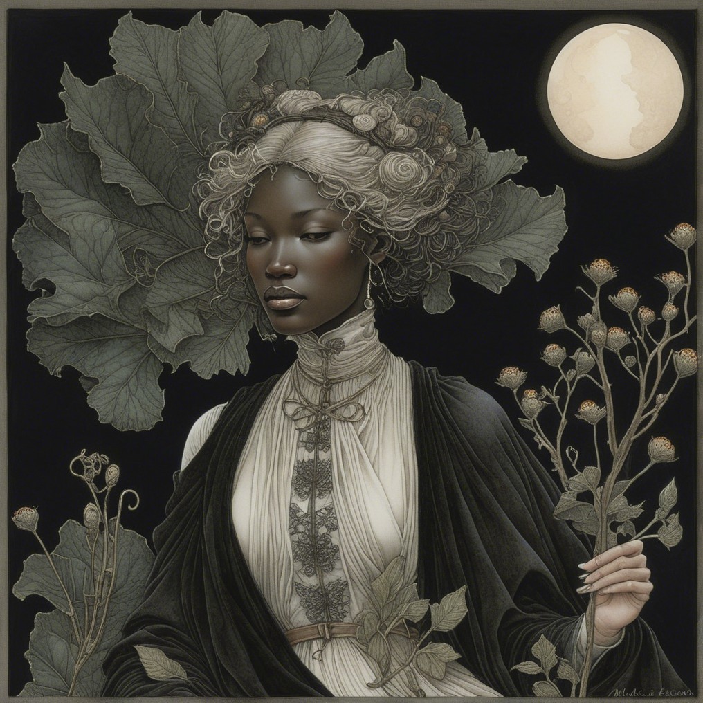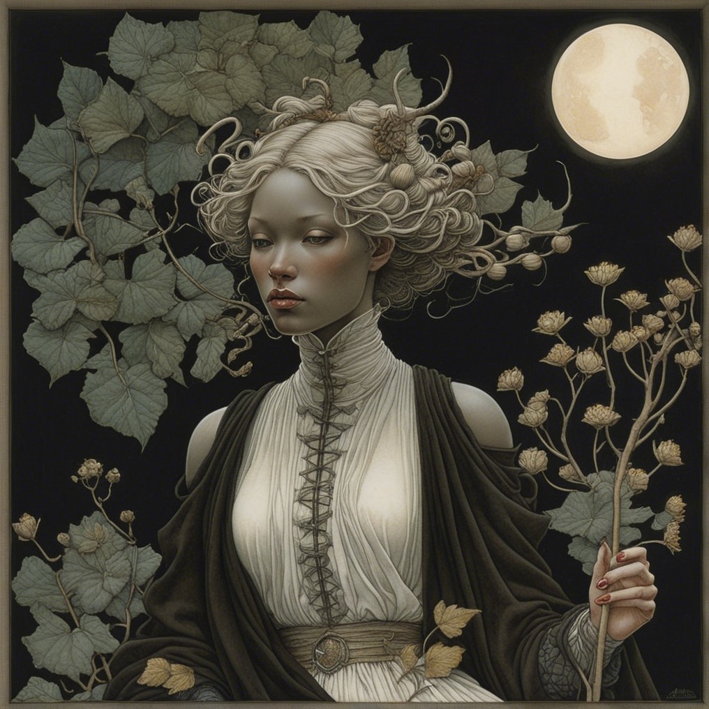 A serene woman with voluminous curly hair stands amidst swirling vines, her eyes closed in contemplation. A full moon illuminates the dark background, enhancing the ethereal atmosphere.