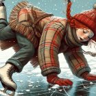 A girl with red braids skates on ice, wearing a cozy plaid coat and a bright red beanie. Snowflakes fall around her as she joyfully glides, showcasing a playful winter scene.