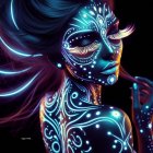 A striking portrait of a woman adorned with vibrant, intricate body paint and luminous colors, creating a mesmerizing blend of artistry and beauty against a dark, atmospheric background.